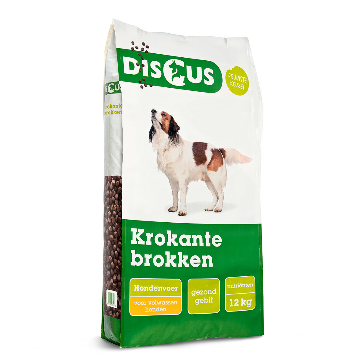 Discus Krokante Brokken 12 kg. Discus Krokante Brokken is een complete maaltijd voor jouw volwassen hond. De brokken bevatten alle belangrijke nutriënten om jouw hond actief en gezond te houden. Zo draagt vitamine D3 eraan bij dat het gebit en de botten sterk blijven. Bovendien zal de hond tijdens het kauwen op de brokken (dankzij de structuur) automatisch zijn gebit reinigen.
