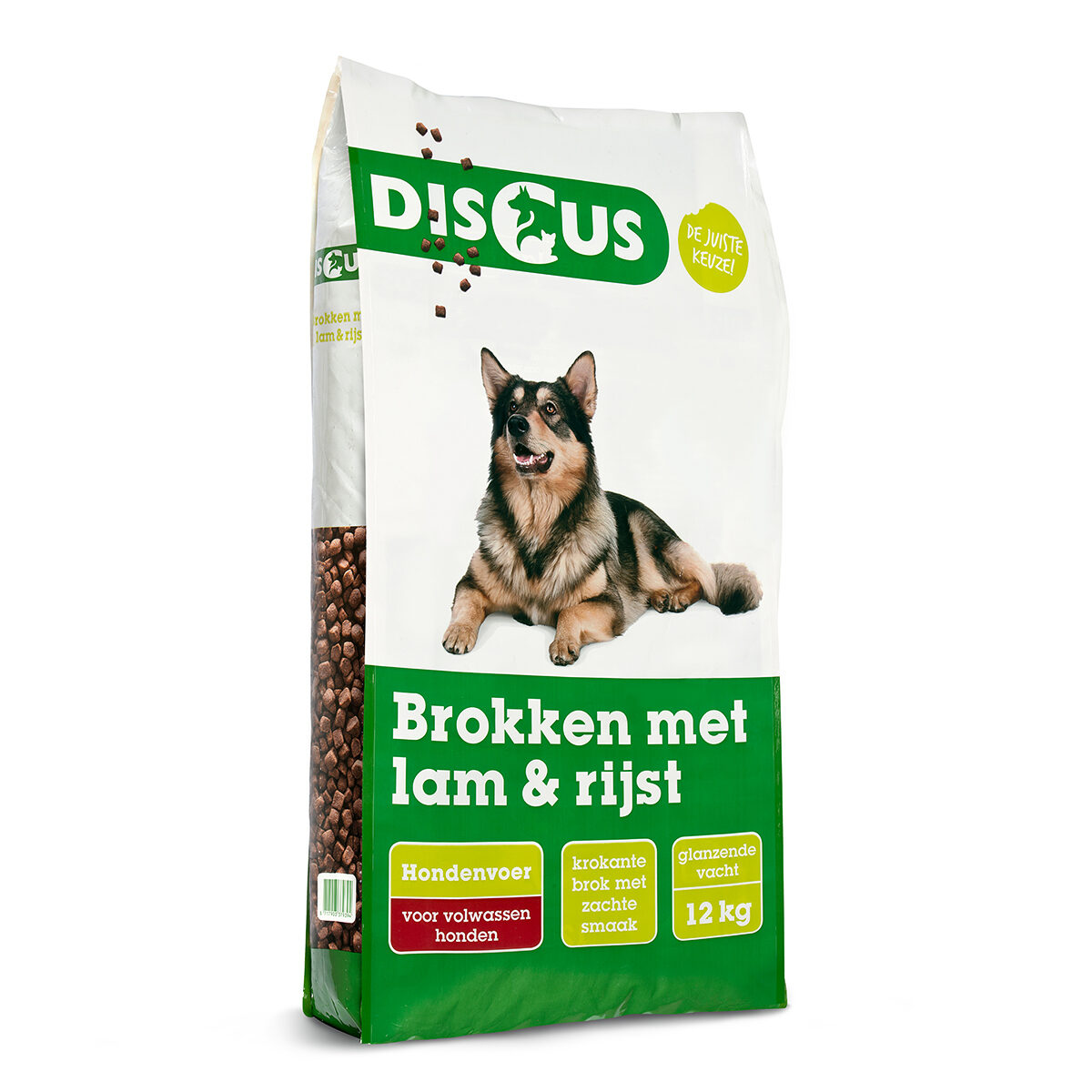 Discus Lam & Rijst Brokken 12 kg. Discus Lam & Rijst Brokken is een complete maaltijd voor jouw volwassen hond. De brokken zijn krokant, licht verteerbaar en bevatten alle belangrijke nutriënten. Dankzij het gist, oliën en vetten draagt dit product bij aan een glanzende vacht. Vanwege de zachte smaak raden we de brokken ook aan voor ‘lastige eters’.