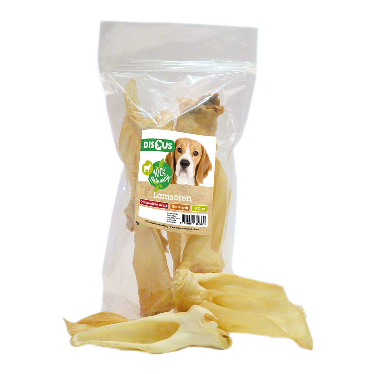 Discus Lamsoren 100 gram. Deze 100% natuurlijke, gedroogde lamsoren van Discus zorgen voor heerlijk kauwplezier voor je hond. De lamsoren zijn over het algemeen wat zachter aan het gebit dan andere kauworen zoals de runderoren of varkensoren. Hierdoor zal je hond er makkelijker op kunnen kauwen en er meer van genieten. De lamsoren zijn dan ook geschikt voor alle honden. Puppy's met puppytandjes en senioren die wat moeite met kauwen krijgen kunnen er wat langer over doen.