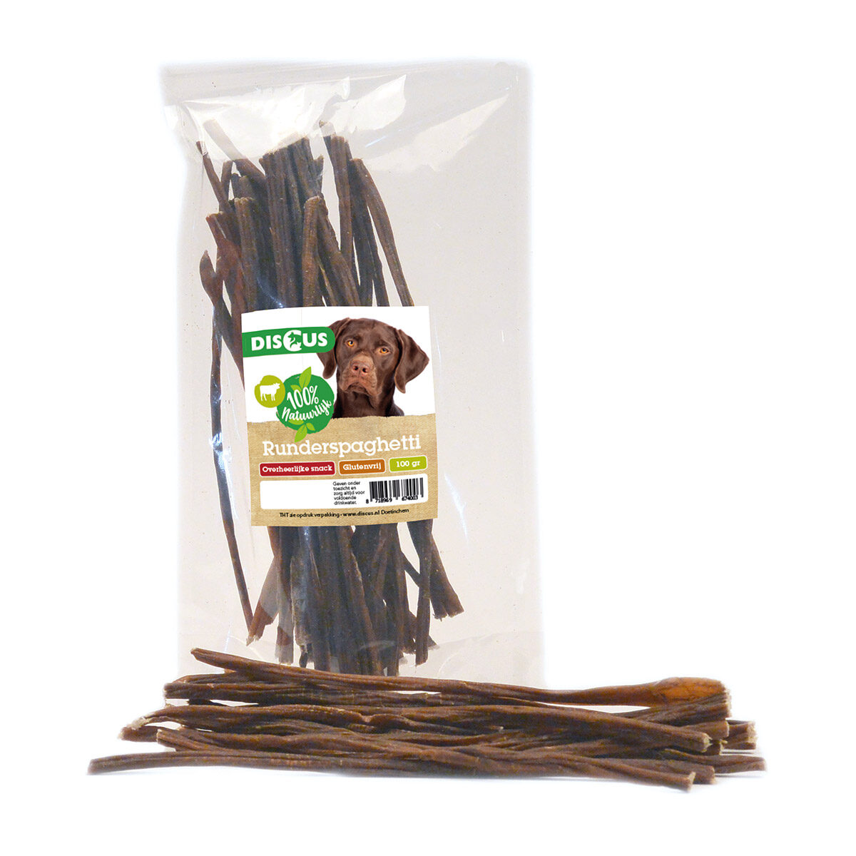 Discus Spaghetti Rund 100 gram. De natuurlijke hondensnack Discus runderspaghetti zijn gedroogde slierten rund waar je hond lekker op kan kauwen. Gedroogde runderspaghetti is een ideale snack voor tussendoor. De runderspaghetti is makkelijk te kauwen en daardoor geschikt voor puppy's, volwassen honden in alle leeftijden en ook voor de senioren die wat moeite met kauwen krijgen.