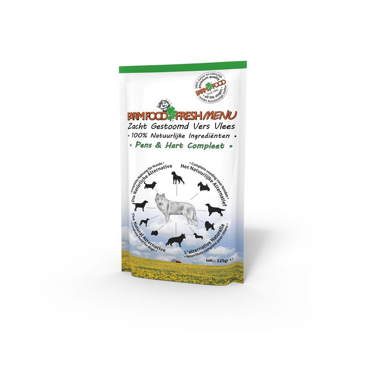 Farm Food Fresh Menu Pens & Hart Compleet 125 gr. Farm Food Fresh Menu is de natuurlijke, gezonde en lekkere complete vers-vleesmaaltijd voor jouw hond. Complete, zacht gestoomde vers-vleesvoeding voor alle honden van pup tot senior. Alle dierlijke ingrediënten in Farm Food Fresh Menu zijn afkomstig van dieren uit de EU die goedgekeurd zijn voor menselijke consumptie. Farm Food Fresh Menu is op basis van rund en bevat geen kip of ander gevogelte. Farm Food Fresh Menu is op basis van puur runderhart, runderpens en rundvlees, aangevuld met Schotse zalmolie, mineralen, organische vitamines en sporenelementen. Farm Food Fresh Menu bevat geen bot en daarom is een gecontroleerde calcium/fosfor verhouding gegarandeerd.