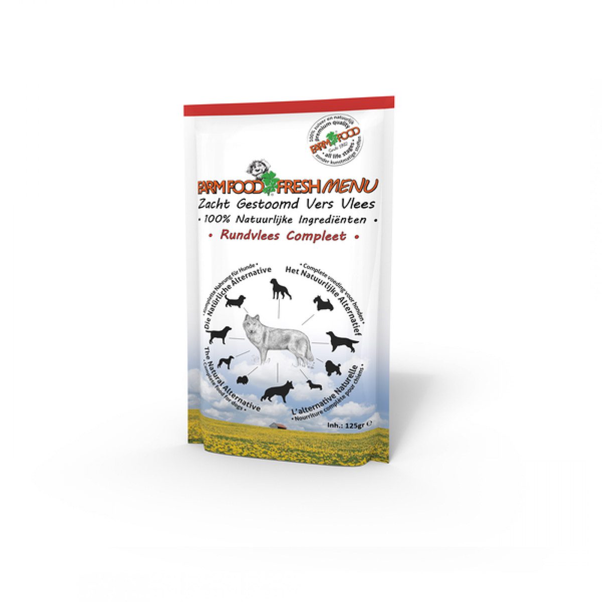 Farm Food Fresh Menu Rundvlees Compleet 125 gr. Farm Food Fresh Menu: de natuurlijke, gezonde en lekkere complete vers-vleesmaaltijd voor jouw hond. Complete, zacht gestoomde vers-vleesvoeding voor alle honden van pup tot senior. Alle dierlijke ingrediënten in Farm Food Fresh Menu zijn afkomstig van dieren uit de EU die goedgekeurd zijn voor menselijke consumptie. Farm Food Fresh Menu is op basis van rund en bevat geen kip of ander gevogelte. Farm Food Fresh Menu is op basis van puur runderhart, runderpens en rundvlees, aangevuld met Schotse zalmolie, mineralen, organische vitamines en sporenelementen. Farm Food Fresh Menu bevat geen bot en daarom is een gecontroleerde calcium/fosfor verhouding gegarandeerd.