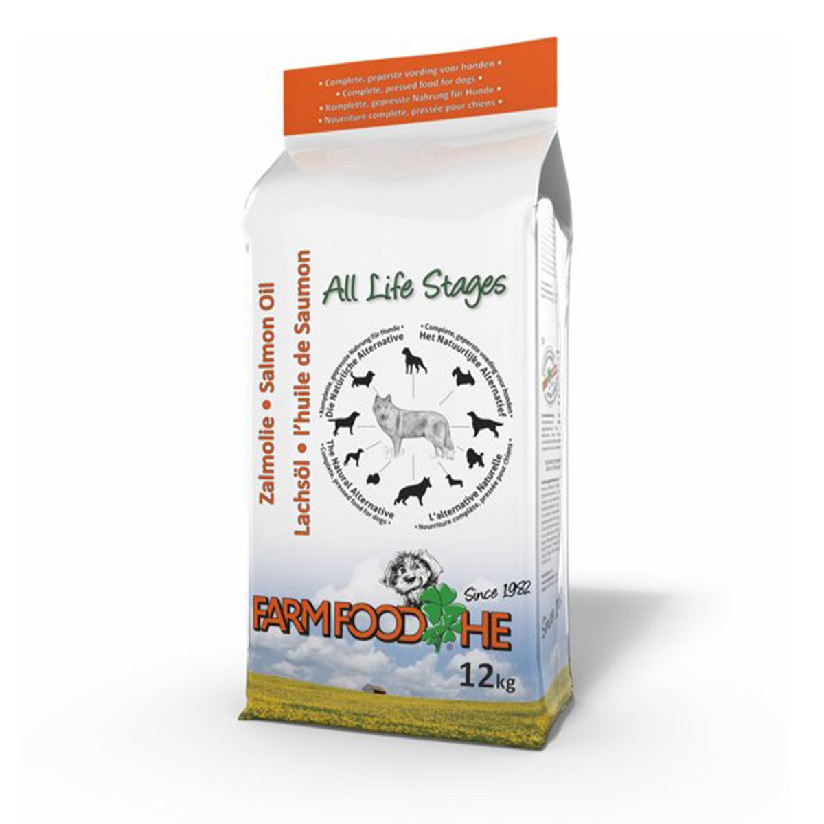 Farm Food He Zalmolie 12 kg. Farm Food HE is een zeer hoogwaardige ‘High Energy’ geperste voeding voor elke hond, ongeacht leeftijd, activiteit of ras. Dit noemen we het ‘All Life Stages’-concept en is gebaseerd op het gegeven dat de spijsvertering bij honden nog steeds gelijk is aan die van hun voorouder, de wolf. In de natuur eten wolven en andere hondachtigen, ongeacht hun leeftijd van hetzelfde prooidier; jonge en drachtige dieren eten meer en oudere dieren eten minder. Dit alles draagt er onder andere aan bij dat pups zeer gelijkmatig groeien zonder vervelende groeipijnen.