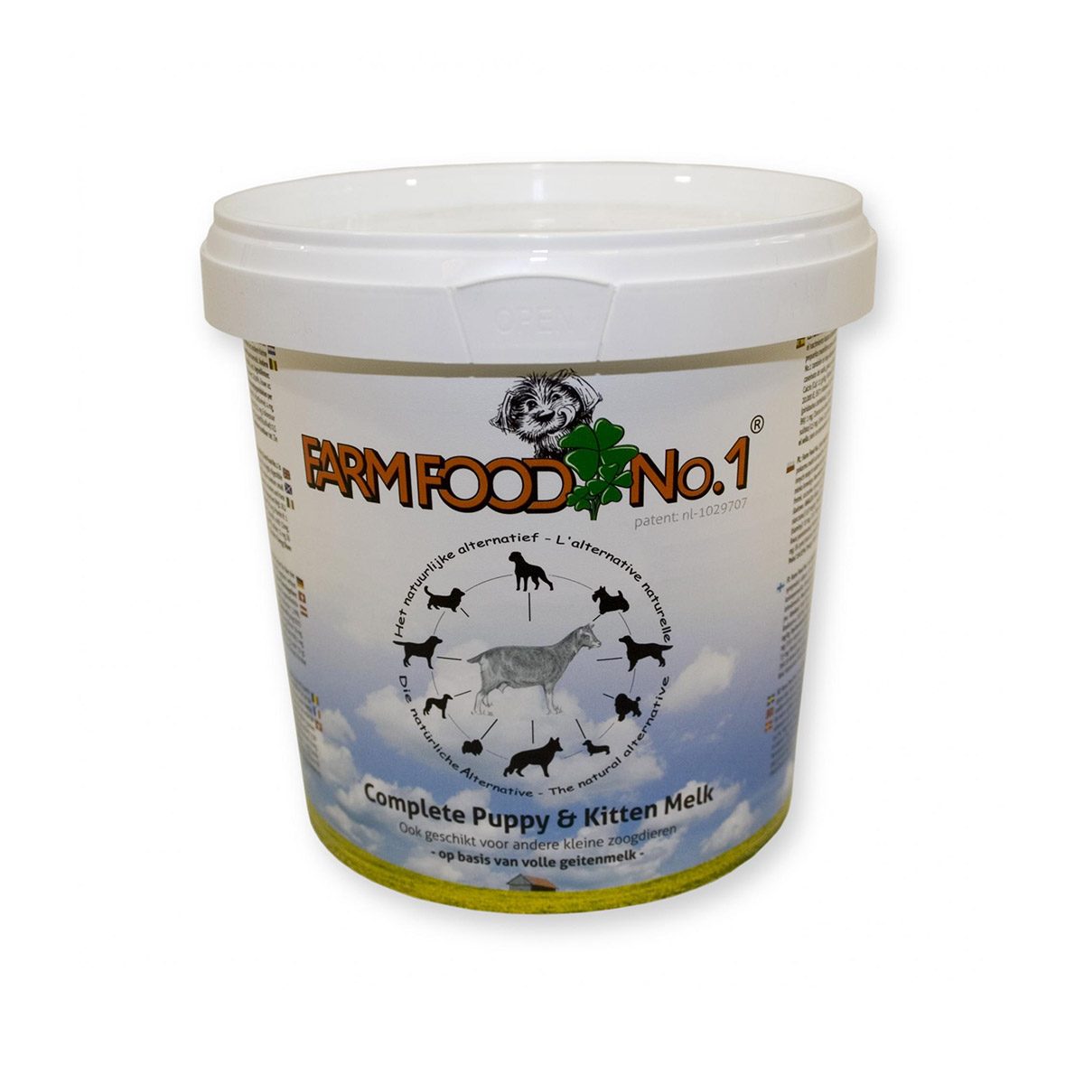 Farm Food No.1 Puppymelk 500 gr. Farm Food No.1 is een complete melkvoeding voor pasgeboren pups, kittens en andere kleine zoogdieren. Het is bedoeld ter vervanging van en als aanvulling op de moedermelk vanaf de geboorte tot en met het spenen. Farm Food No.1 is op basis van volle geitenmelkpoeder. De keuze voor volle geitenmelkpoeder is gemaakt vanwege het feit dat geitenmelk van nature voor pups, kittens en andere kleine zoogdieren een veel betere samenstelling heeft dan koemelk. Het is lichter verteerbaar en komt, zowel in aminozuurpatroon als in vetzuurpatroon, veel meer overeen met de moedermelk dan koemelk.