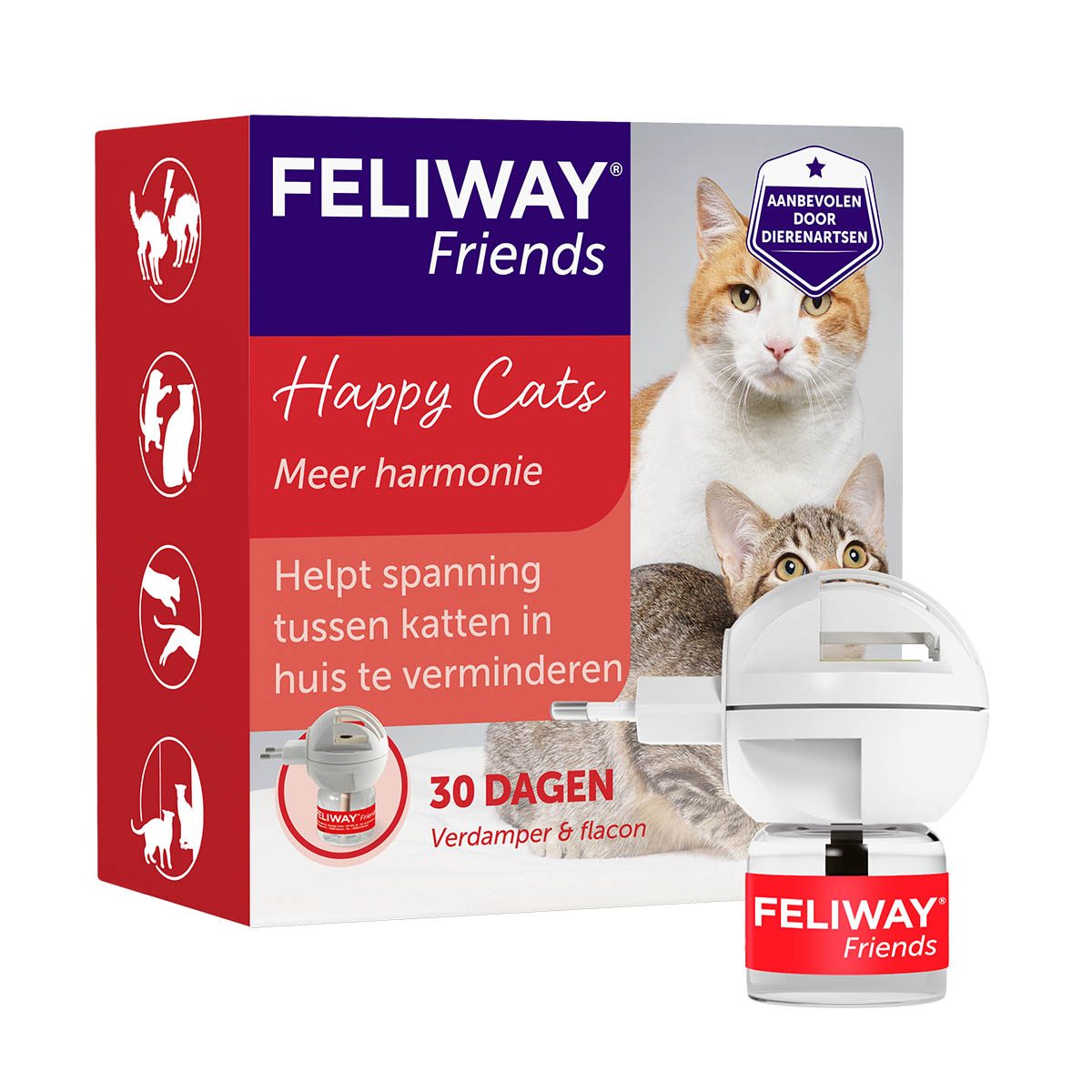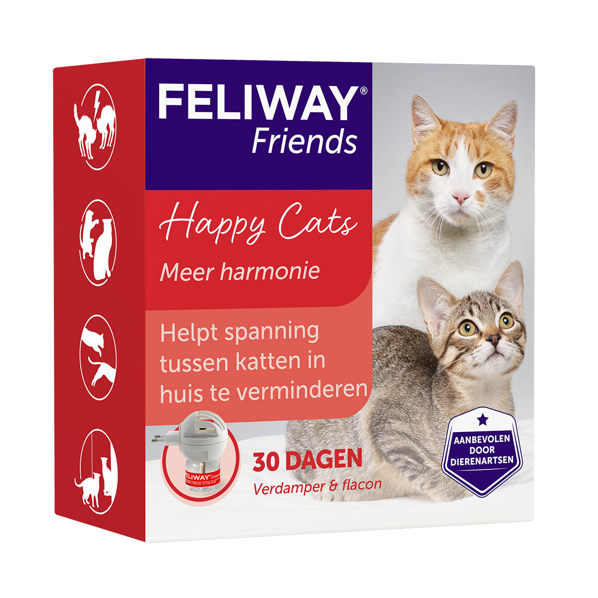 FELIWAY FRIENDS is een kopie van het kateigen moederferomoon dat ervoor zorgt dat katten een band creëren en in harmonie samen kunnen leven. Het vermindert spanningen en conflicten tussen katten in één huishouden, zoals vechten, staren, blokkeren, agressie en najagen.
