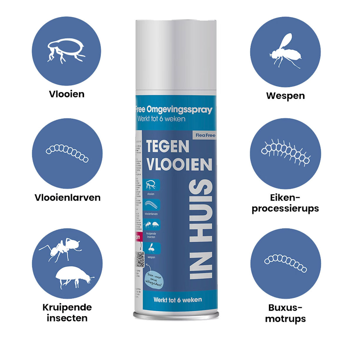 Flea Free Omgevingsspray, omdat 95% van de vlooien(stadia) zich in de omgeving bevindt!