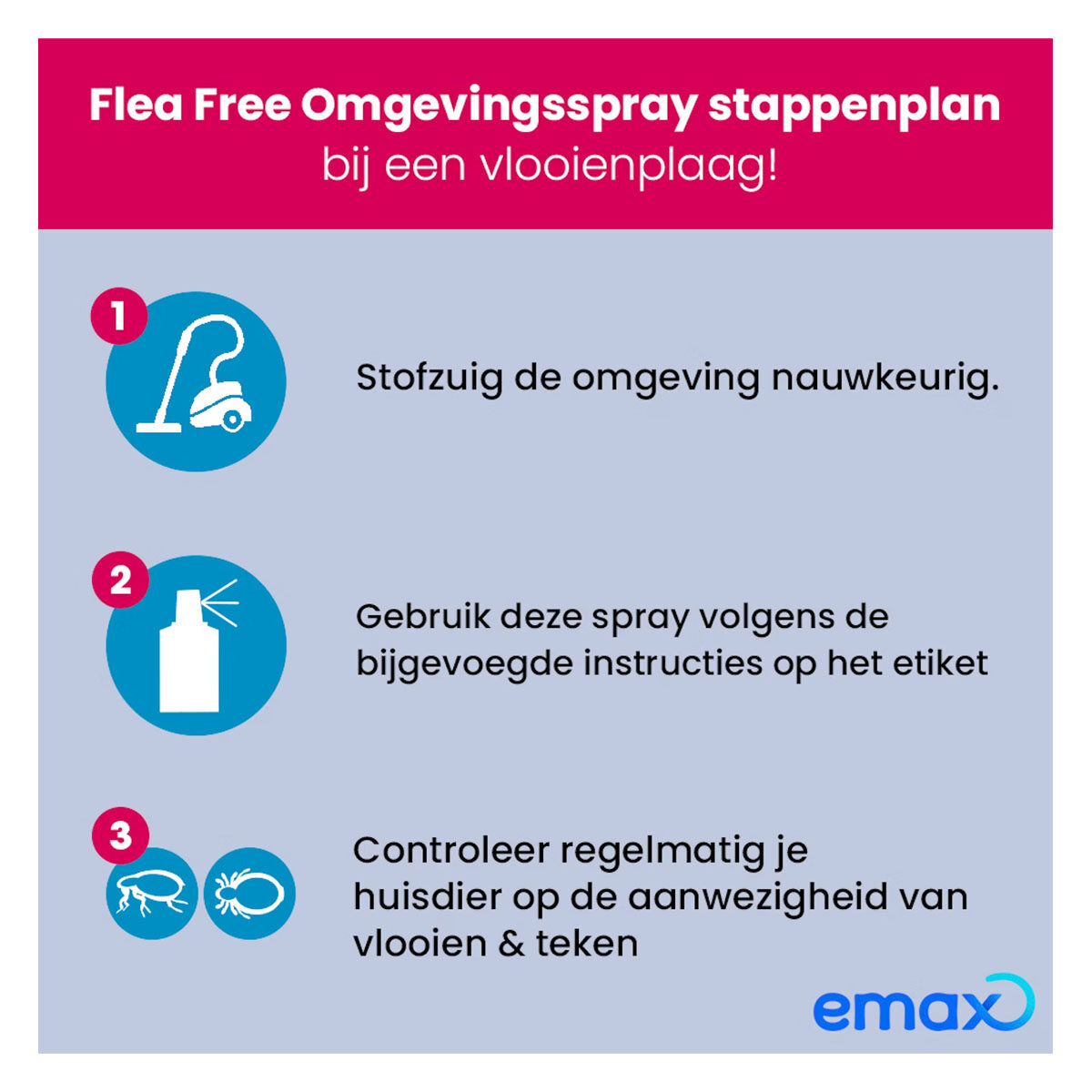 LET OP! De Flea Free Omgevingsspray is alleen geschikt voor de omgeving en mag niet op het dier gebruikt worden.