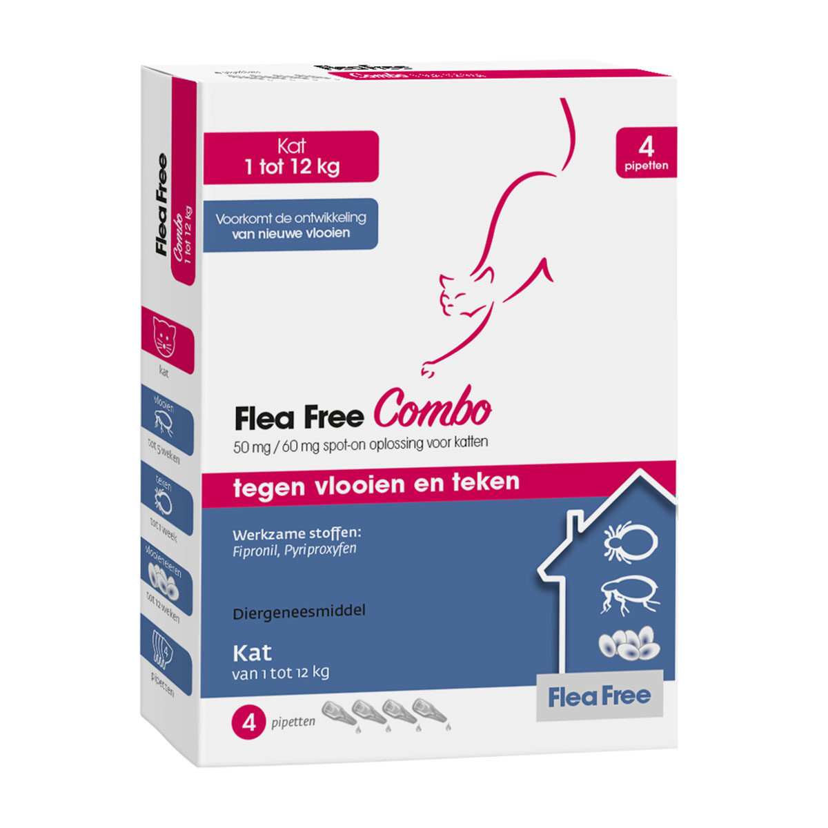 Flea Free spot-on Combo (voorheen Flea Free Ectoline Duo) is een vlooien- en tekenpipet met de werkzame stoffen Fipronil en Pyriproxyfen. Deze vlooien- en tekenpipetten hebben dezelfde werking als Frontline spot-on Combo. Na toediening van deze handige drop-stop pipet is jouw hond of kat beschermd tegen vlooien (tot 7 weken bij honden en tot 5 weken bij katten) en teken (tot 4 weken bij honden en tot 1 week bij katten). De werkzame stof Fipronil doodt binnen 24 uur de aanwezige vlooien en binnen 48 uur de aanwezige teken op het dier. De werkzame stof Pyriproxyfen doet zijn werking in huis (de omgeving). Het voorkomt de ontwikkeling van vlooienlarven en -eieren in de omgeving. Zo voorkom je de ontwikkeling van een ernstige vlooienplaag.