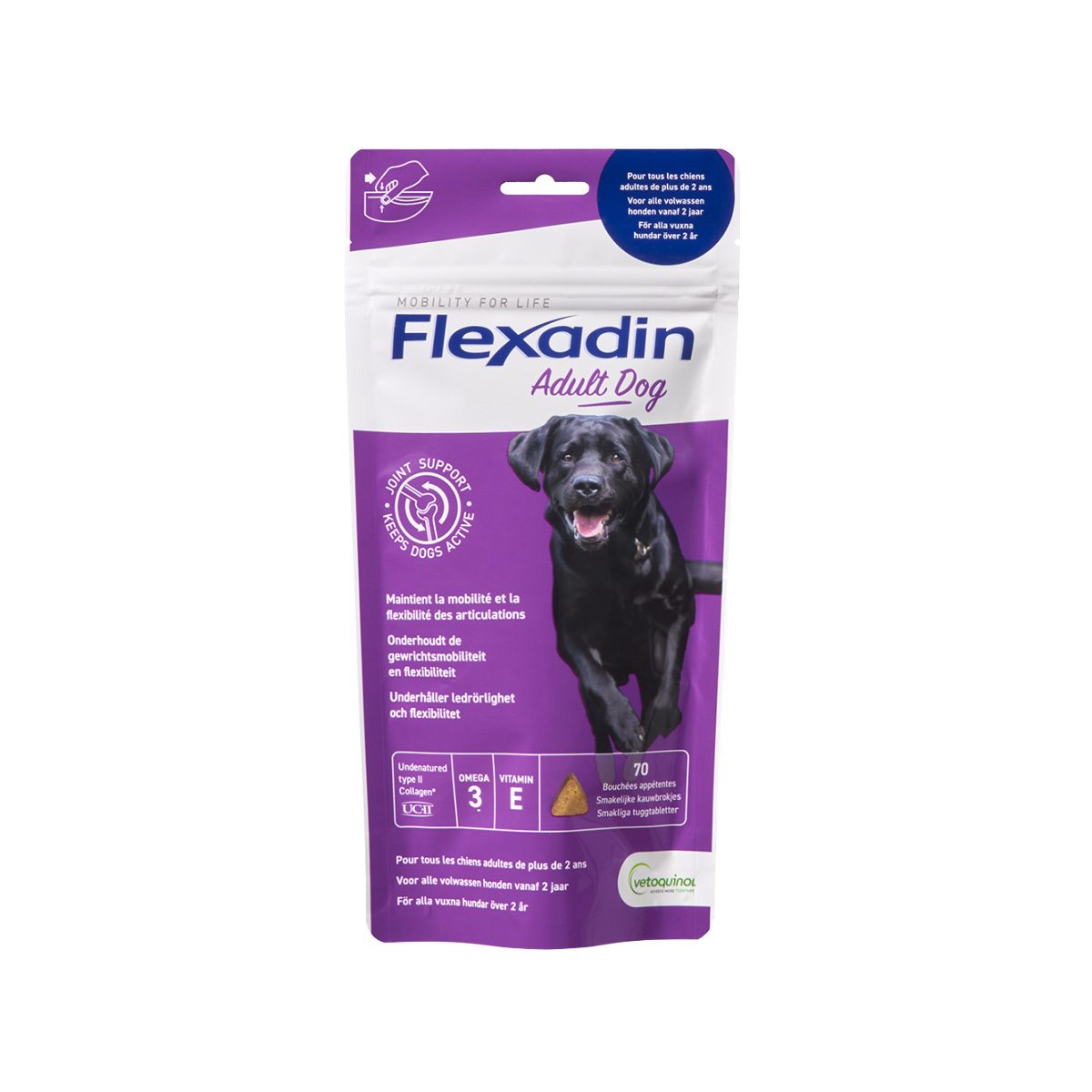 De Chews van Flexadin is een voedingssupplement speciaal ontwikkeld voor volwassen en senior honden die ouder zijn dan 2 jaar. De unieke combinatie van UC-II®, Omega 3-vetzuren en Vitamine E zorgen voor de ondersteuning van de gewrichten van de hond.