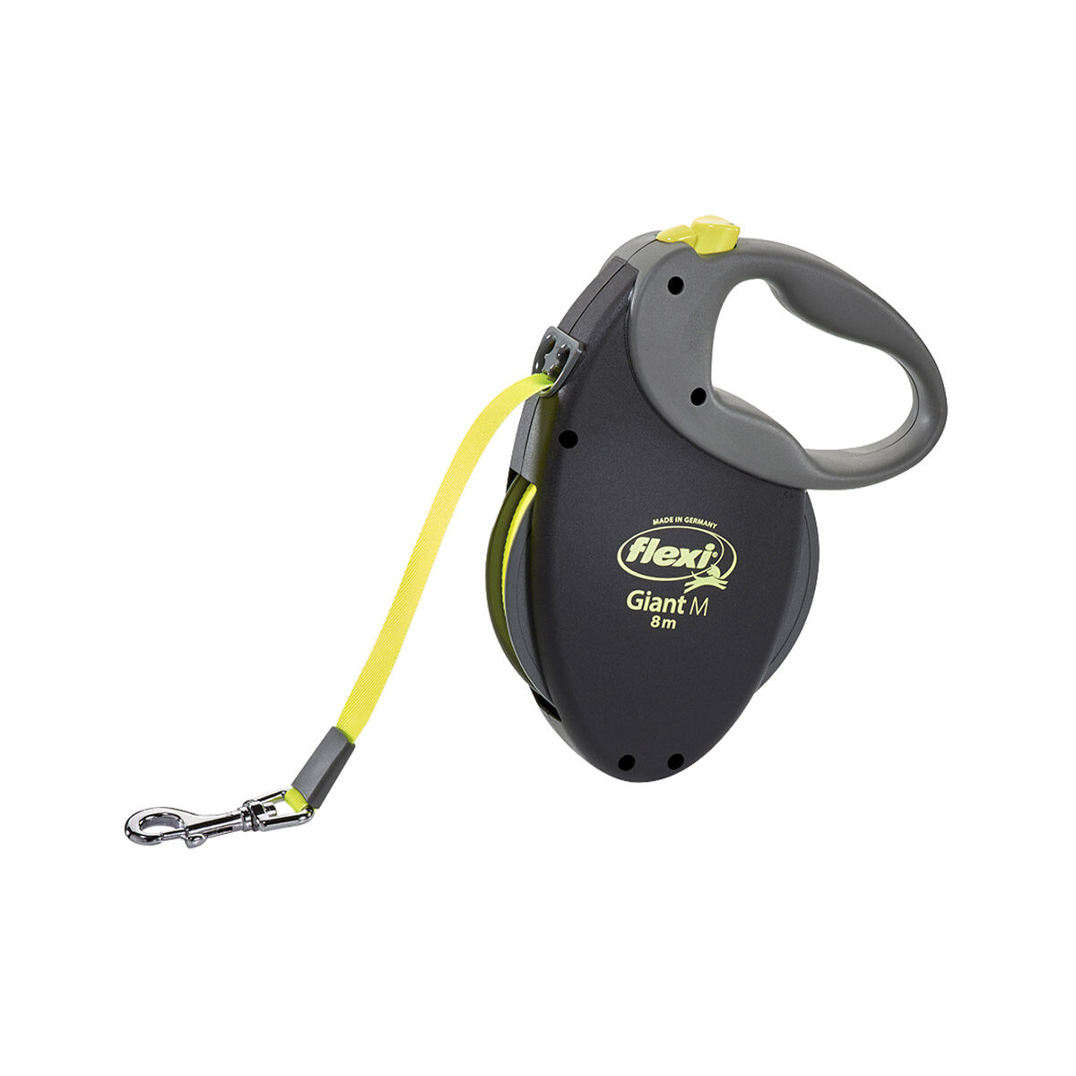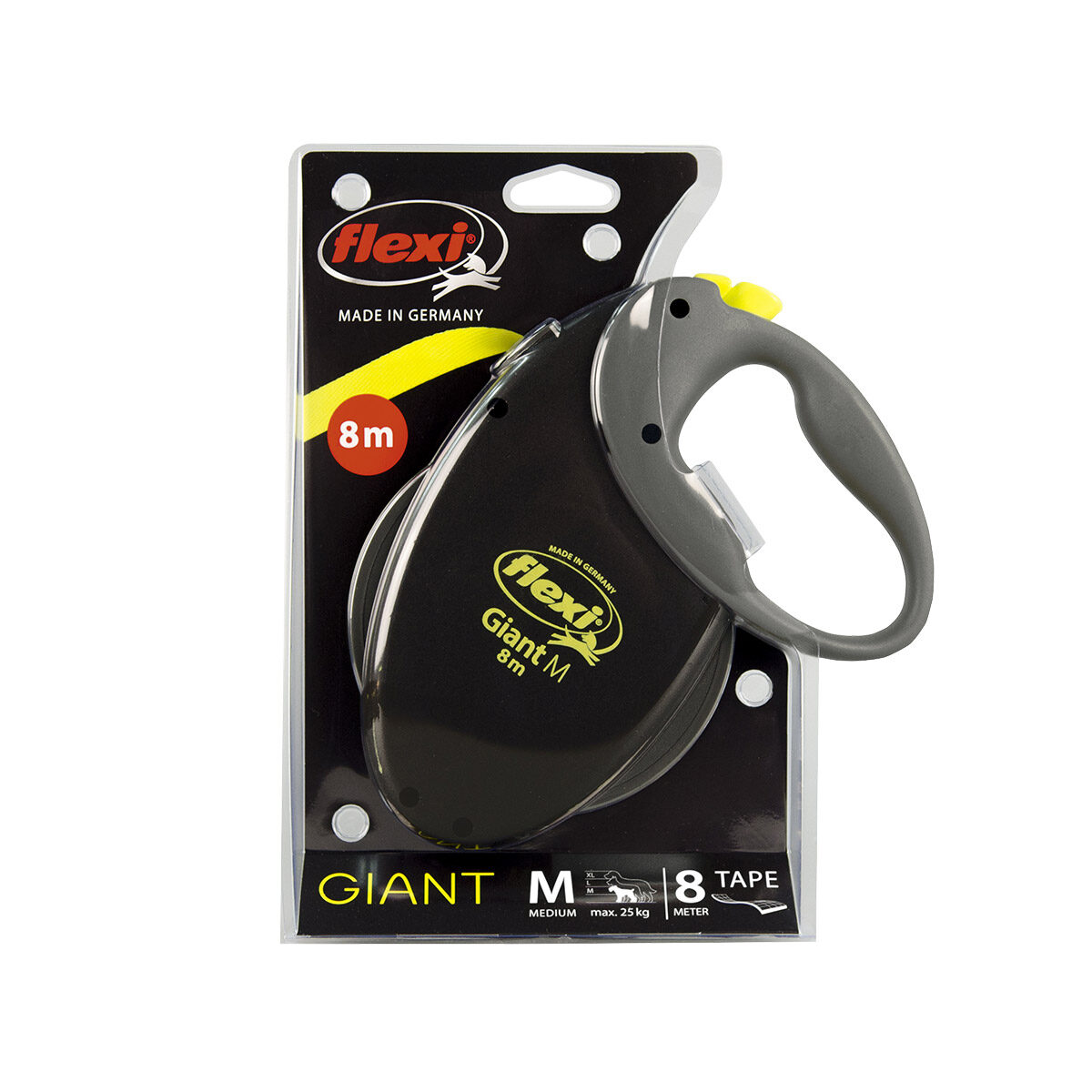 Deze uitrollijn van de Flexi Tape bevat een 8 meter lange band gemaakt van lint en heeft een opvallende neon kleur. Dankzij de Neon tape en de reflecterende zijdes op de comfortabele handgreep, is de rollijn goed zichtbaar in het donker. De M Giant rollijnen zijn geschikt voor de middelgrote honden met een lichaamsgewicht tot 25 kilogram. De Flexi Rollijn Tape is ook verkrijgbaar in maat L 8 meter, maat L 10 meter en maat XL 8 meter. De Flexi Rollijn Tape L 10 meter is de kortste maat in deze serie rollijnen van het merk Flexi.