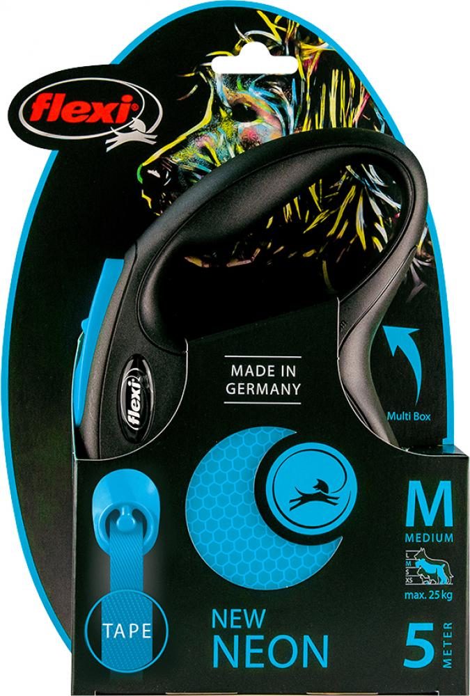 Maximale vrije looplengte 5 meter._x000D_ De flexi rollijn NEW NEON tape M, is geschikt voor honden tot ± 25 kg._x000D_ _x000D_ NEW NEON zichtbare veiligheid. De NEW NEON is de flexi die opvalt. Bij zon door het markante design, in de schemering door haar reflector en altijd positief dankzij haar flexi-kwaliteiten.