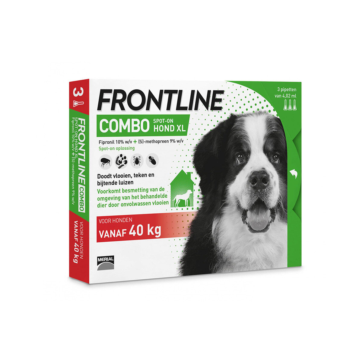 Frontline Combo Hond is een vloeistof tegen vlooien, teken en bijtende luizen. De druppels hebben ook een dubbele functie. Het werkt namelijk ook vlooieneitjes, -larven en de ontwikkeling van nieuwe poppen tegen. Frontline Combo Hond beschermt tegen vlooien op je hond en in zijn omgeving. Frontline Combo doodt vlooien binnen 24 uur en teken en luizen bij de hond binnen 48 uur na toediening. Let op: De verpakking van Frontline ondergaat een vernieuwing. De verpakking is het enige dat verandert, het product blijft hetzelfde. Eigenschappen Frontline Combo Stopt ontwikkeling van vlooieneitjes, -larven en -poppen. Je hond wordt 8 weken tegen vlooien en 4 weken tegen teken beschermd. Voorkomt dat de omgeving wordt besmet door onvolwassen vlooien. Voor honden die ouder zijn dan 8 weken en zwaarder zijn dan 2 kilo. In 4 eenheden: Puppy S (2 tot 10 kilo), M (10 tot 20 kilo), L (20 tot 40 kilo) en XL (vanaf 40 kilo). Gebruik een combinatie als je hond zwaarder is dan 60 kilo. Verpakkingen met 1, 3 of 6 dosering(en). Gedurende zes weken wordt de werkingsduur van Frontline Combo niet verkort door blootstelling aan water, tenzij dit binnen twee dagen na toediening gebeurd. Lees voor gebruik de bijsluiter. Toediening De pipet met de vloeistof dient tijdens de behandeling leeg geknepen te worden tussen de schouderbladen. Varianten Frontline Combo Hond is verkrijgbaar in vier verschillende varianten. Welke variant u nodig heeft, is afhankelijk van het lichaamsgewicht van uw hond. Frontline Combo Hond - S: Geschikt voor honden van 2 tot 10 kg. Frontline Combo Hond - M: Geschikt voor honden van 10 tot 20 kg. Frontline Combo Hond - L: Geschikt voor honden van 20 tot 40 kg. Frontline Combo Hond - XL: Geschikt voor honden van 40 tot 60 kg. Werkzame bestanddelen Fipronil en S-Methopreen Contra-indicaties Frontline Combo niet toedienen aan puppy's jonger dan acht weken oud en/of aan puppy's die minder dan 2 kg wegen. Niet gebruiken bij zieke of herstellende dieren. Niet gebruiken bij andere dieren dan honden.