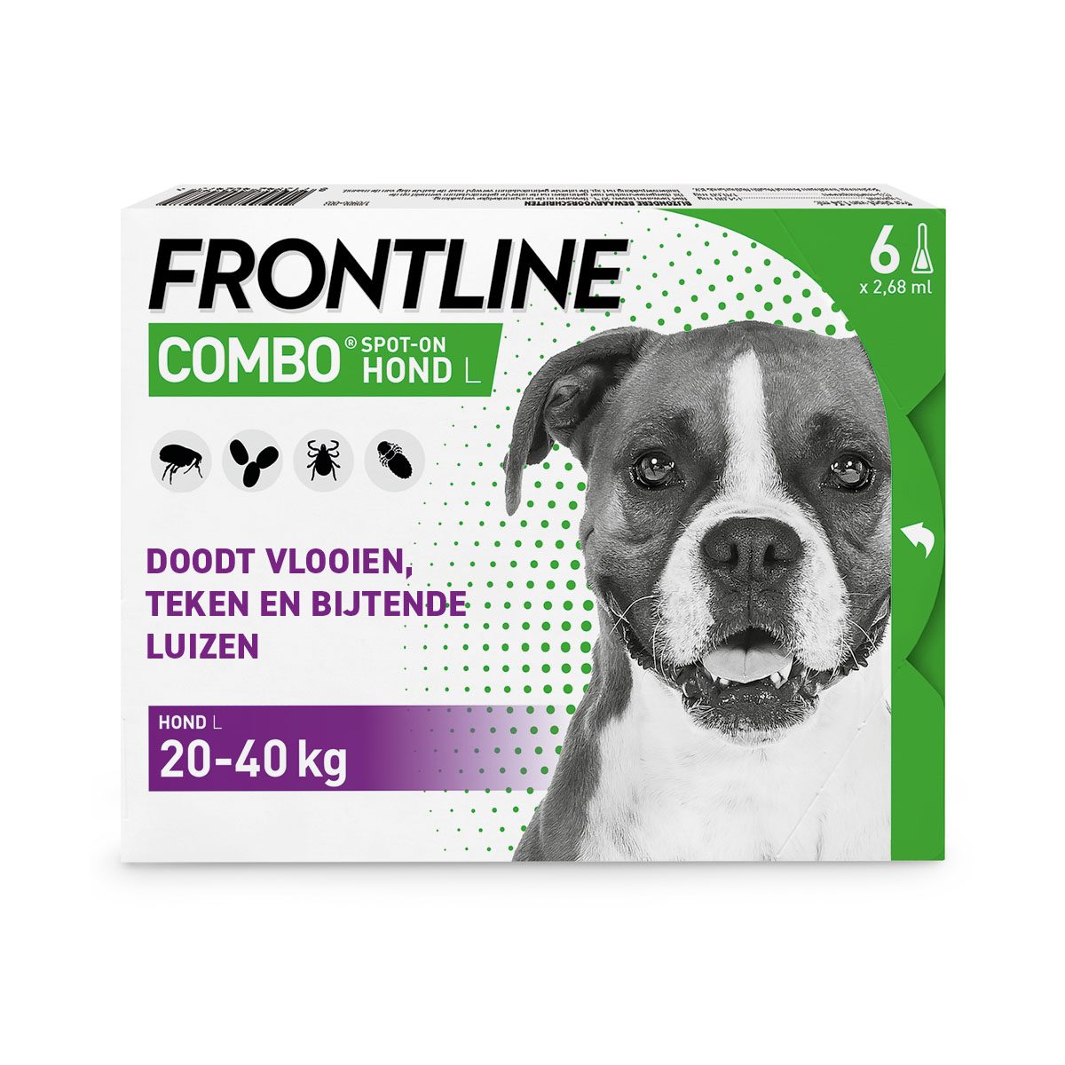Frontline Combo Hond is een vloeistof tegen vlooien, teken en bijtende luizen. De druppels hebben ook een dubbele functie. Het werkt namelijk ook vlooieneitjes, -larven en de ontwikkeling van nieuwe poppen tegen. Frontline Combo Hond beschermt tegen vlooien op je hond en in zijn omgeving. Frontline Combo doodt vlooien binnen 24 uur en teken en luizen bij de hond binnen 48 uur na toediening. Let op: De verpakking van Frontline ondergaat een vernieuwing. De verpakking is het enige dat verandert, het product blijft hetzelfde. Eigenschappen Frontline Combo Stopt ontwikkeling van vlooieneitjes, -larven en -poppen. Je hond wordt 8 weken tegen vlooien en 4 weken tegen teken beschermd. Voorkomt dat de omgeving wordt besmet door onvolwassen vlooien. Voor honden die ouder zijn dan 8 weken en zwaarder zijn dan 2 kilo. In 4 eenheden: Puppy S (2 tot 10 kilo), M (10 tot 20 kilo), L (20 tot 40 kilo) en XL (vanaf 40 kilo). Gebruik een combinatie als je hond zwaarder is dan 60 kilo. Verpakkingen met 1, 3 of 6 dosering(en). Gedurende zes weken wordt de werkingsduur van Frontline Combo niet verkort door blootstelling aan water, tenzij dit binnen twee dagen na toediening gebeurd. Lees voor gebruik de bijsluiter. Toediening De pipet met de vloeistof dient tijdens de behandeling leeg geknepen te worden tussen de schouderbladen. Varianten Frontline Combo Hond is verkrijgbaar in vier verschillende varianten. Welke variant u nodig heeft, is afhankelijk van het lichaamsgewicht van uw hond. Frontline Combo Hond - S: Geschikt voor honden van 2 tot 10 kg. Frontline Combo Hond - M: Geschikt voor honden van 10 tot 20 kg. Frontline Combo Hond - L: Geschikt voor honden van 20 tot 40 kg. Frontline Combo Hond - XL: Geschikt voor honden van 40 tot 60 kg. Werkzame bestanddelen Fipronil en S-Methopreen Contra-indicaties Frontline Combo niet toedienen aan puppy's jonger dan acht weken oud en/of aan puppy's die minder dan 2 kg wegen. Niet gebruiken bij zieke of herstellende dieren. Niet gebruiken bij andere dieren dan honden.