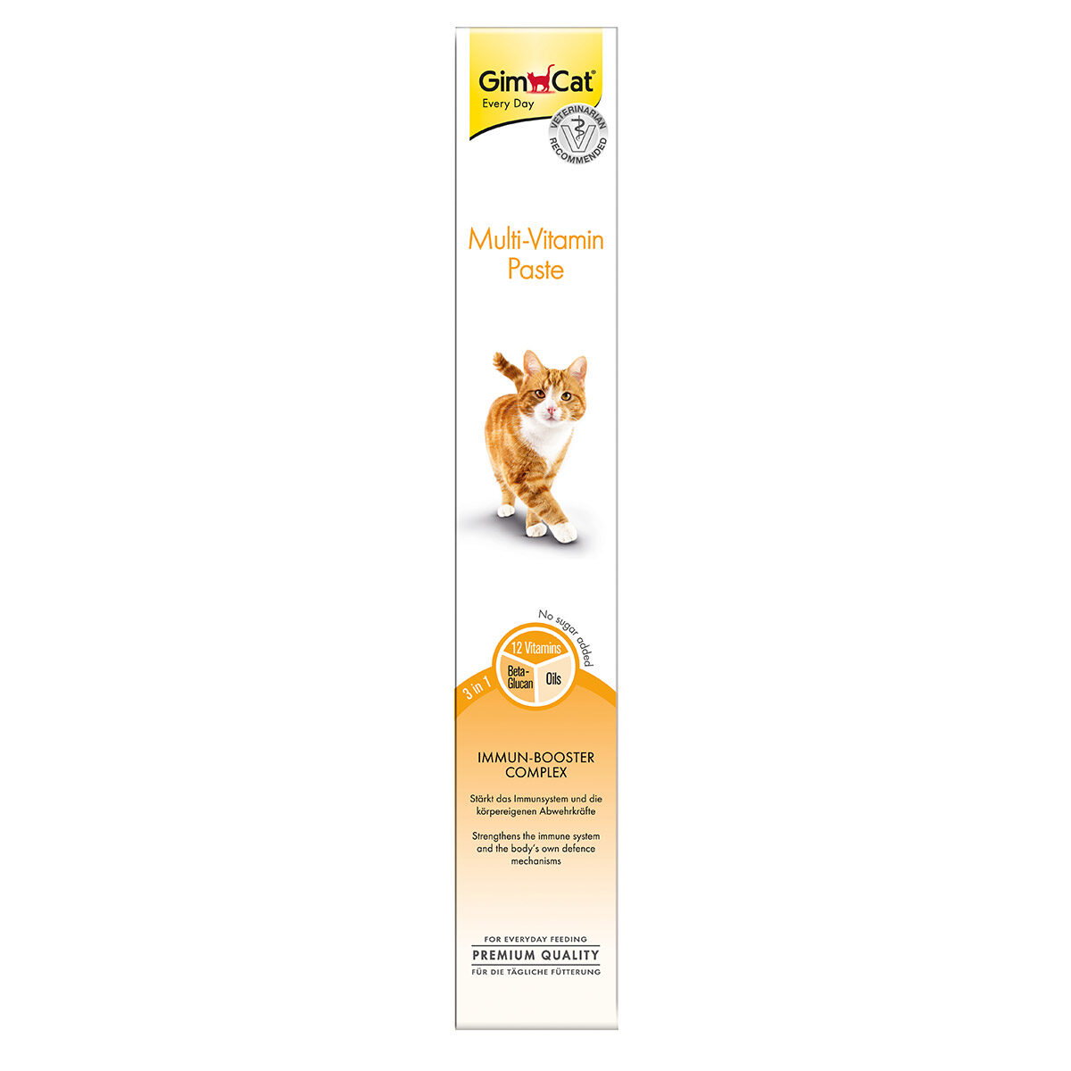 GimCat Multi-Vitaminepasta 100 gr. GimCat Multi-Vitamine Pasta bevat 12 vitaminen die noodzakelijk zijn ter versterking van het eigen natuurlijke weerstandsvermogen. Waardevolle opbouwstoffen en voedingsvezels zijn bevorderlijk voor de ontwikkeling, een mooie huid en vacht en het welbevinden. Ook zeer aan te bevelen voor fok- en tentoonstellingskatten.