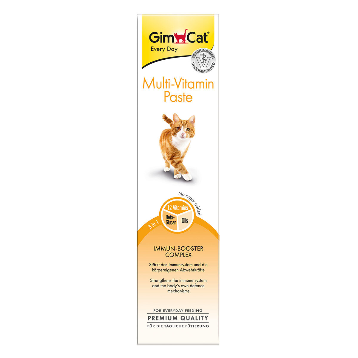 GimCat Multi-Vitaminepasta 200 gr. GimCat Multi-Vitamine Pasta bevat 12 vitaminen die noodzakelijk zijn ter versterking van het eigen natuurlijke weerstandsvermogen. Waardevolle opbouwstoffen en voedingsvezels zijn bevorderlijk voor de ontwikkeling, een mooie huid en vacht en het welbevinden. Ook zeer aan te bevelen voor fok- en tentoonstellingskatten.