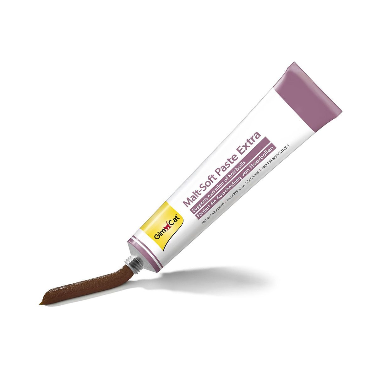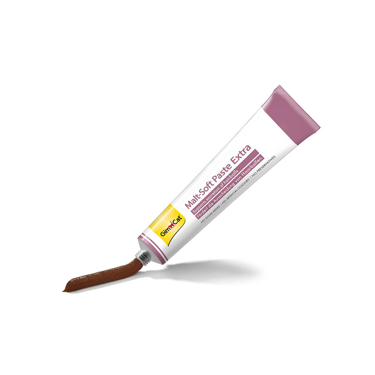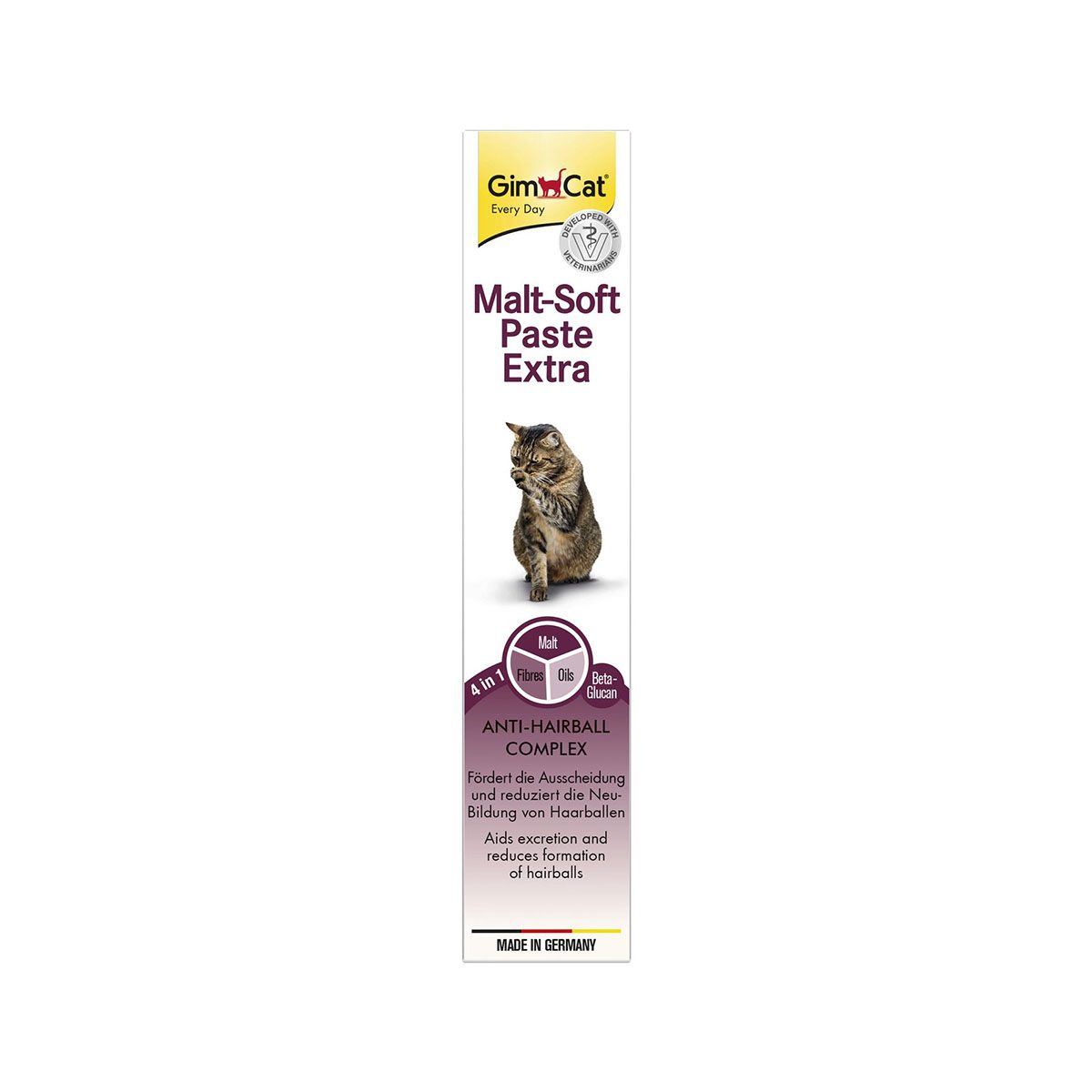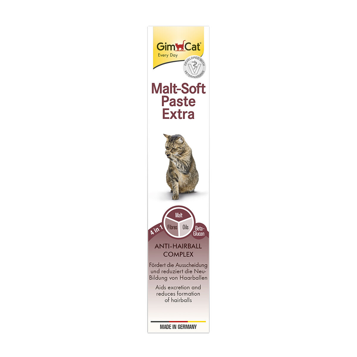 GimCat Pasta Malt-Soft Extra 50 gr. GimCat Malt-Soft Pasta Extra bevat natuurzuivere, aromatische mout en plantaardige olie. In combinatie met voedingsvezels stimuleert Malt-Soft Extra de darmactiviteit en bevordert zo de natuurlijke uitscheiding van ingeslikte haren en onverteerbare bestanddelen. Bovendien worden spijsverteringsstoornissen door de vorming van haarballen voorkomen en de opgenomen beta-glucanen werken preventief tegen ontstekingen in het maag-darmstelsel.
