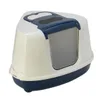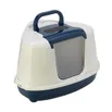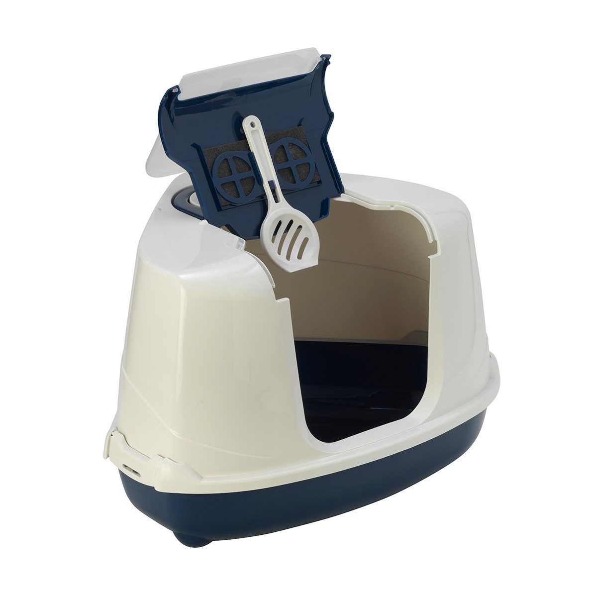 Kat Toilet Flipcorner Donkerblauw wit. Dit Hoektoilet Flipcorner voor katten is speciaal ontworpen om in een hoek te kunnen plaatsen. Het doorschijnende klapdeurtje zorgt ervoor dat het binnen in het kattentoilet ook enigszins verlicht blijft en je kat niet in het donker de behoefte hoeft te doen. Aan de bovenzijde van dit donkerblauw/witte Hoektoilet Flipcorner voor katten zit zowel een handige handgreep voor het verplaatsen van de kattenbak als ook een naar boven openklapbare opening waardoor het gemakkelijker wordt om de kattenbak te verschonen. Een handig detail hierbij is dat er een schep aan de binnenzijde van deze klep bevestigd zit. Het opklapbare gedeelte beschikt zelfs over een filter om de verspreiding van nare geurtjes tegen te gaan.