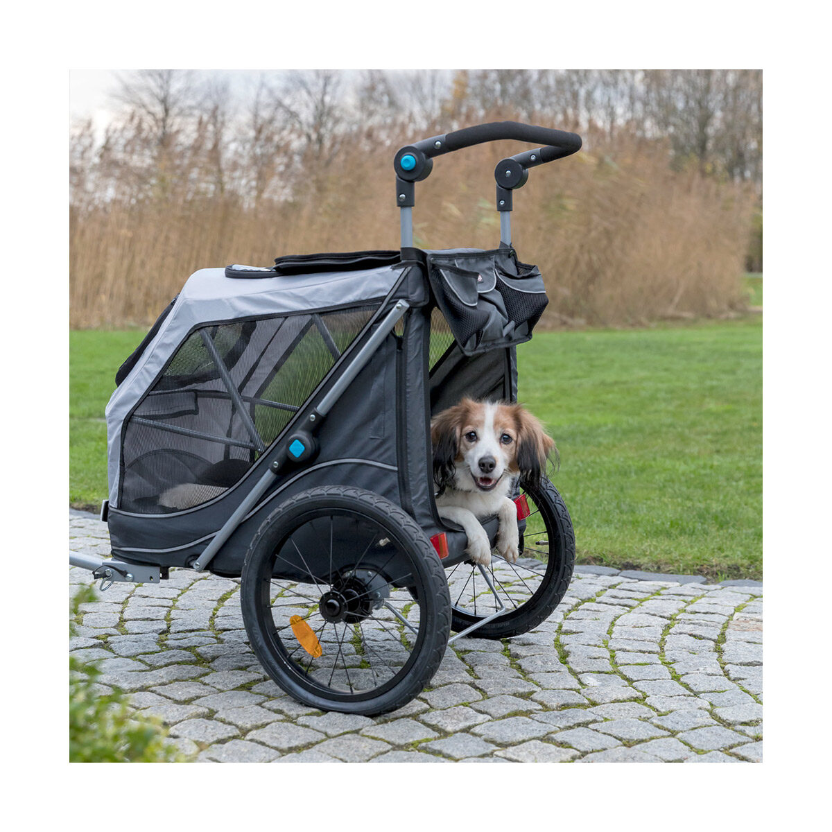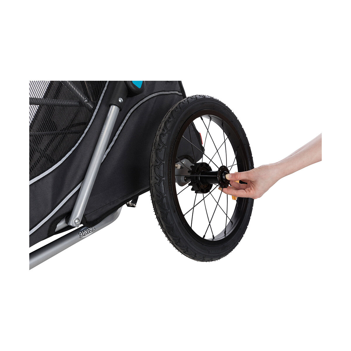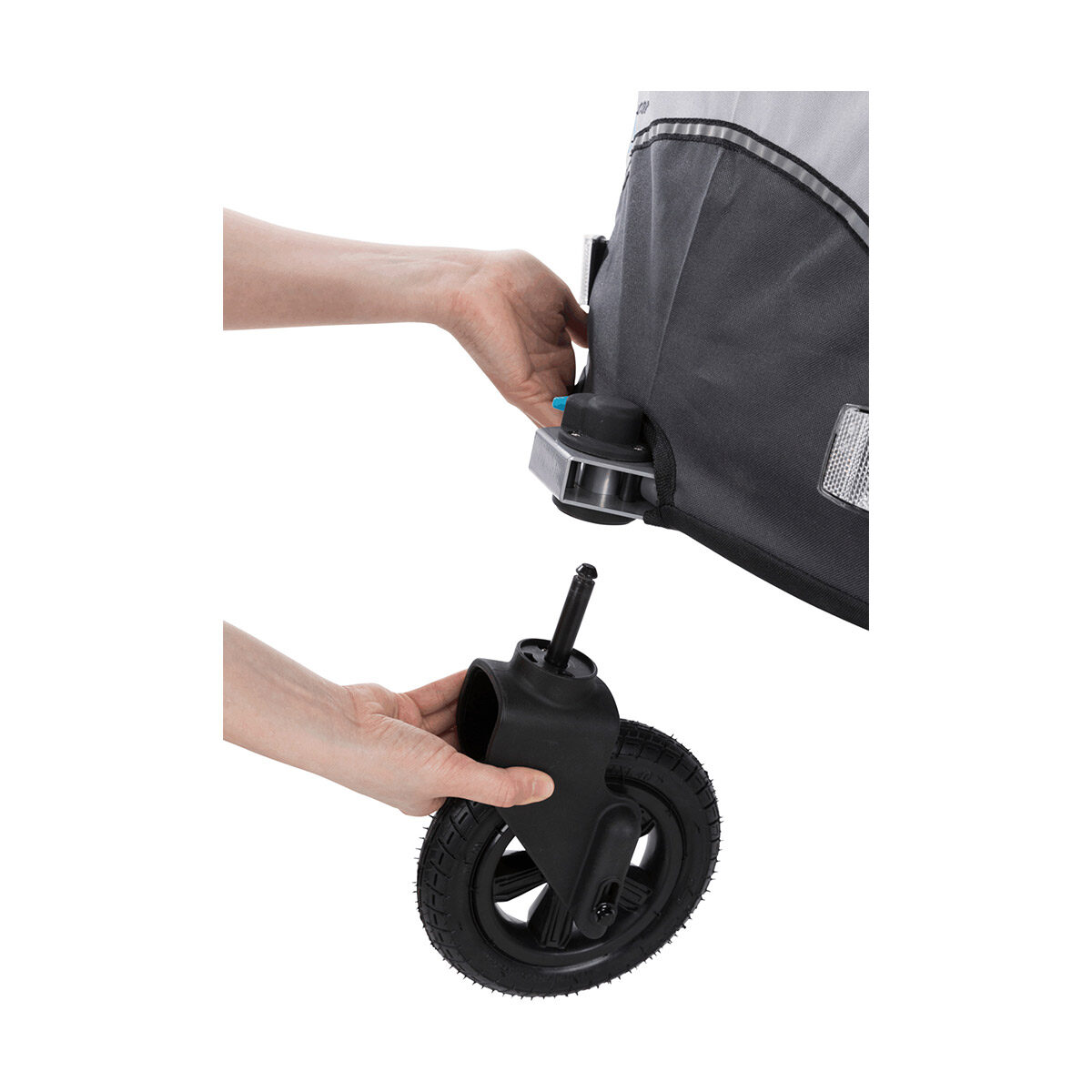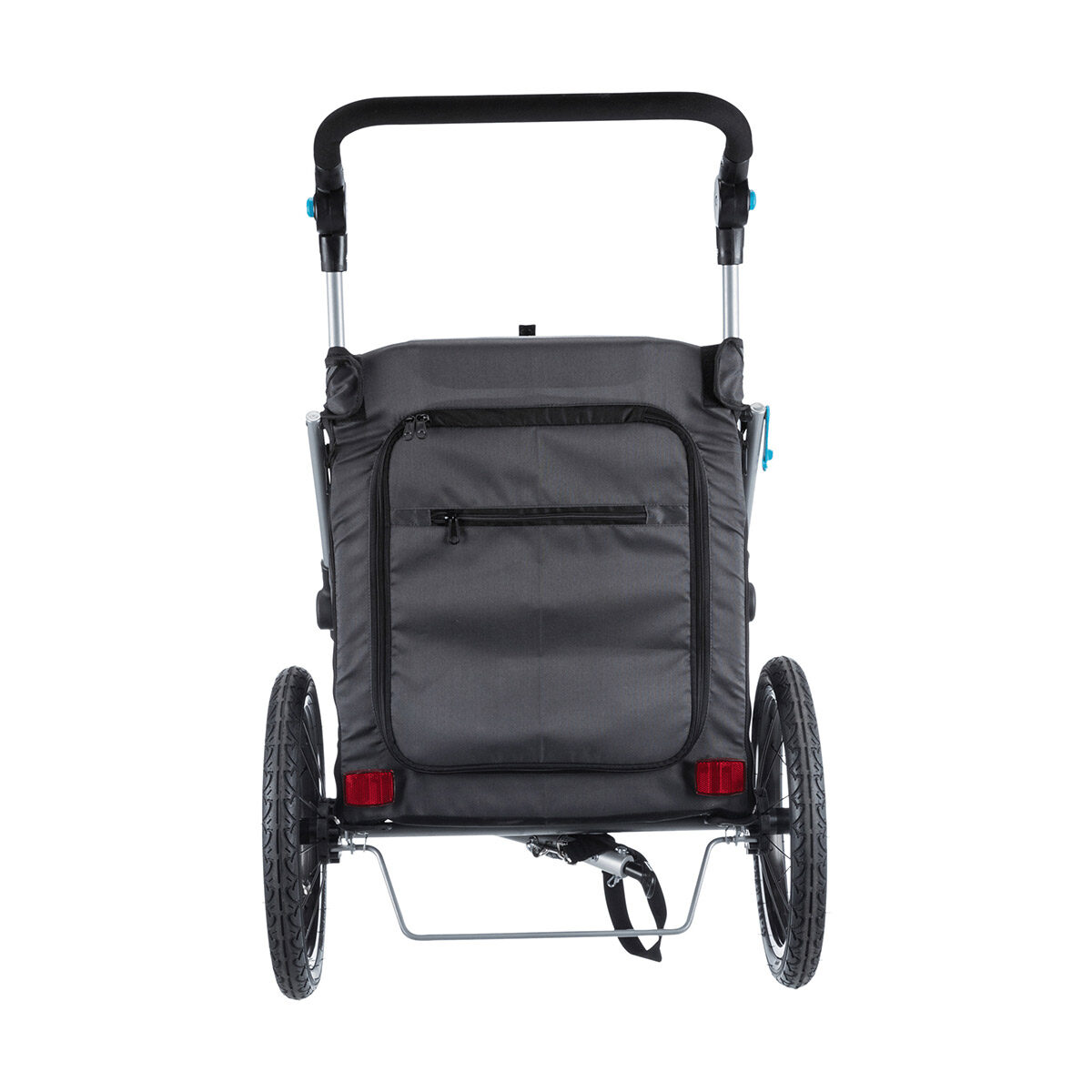 Een extra optie is om de Fietskar om te bouwen naar een buggy met de Jogging Wiel van Trixie. Dit wiel kan je monteren aan de voorkant van de Fietskar. De Fietskar heeft een in hoogte verstelbare duwstang om comfortabel rond te kunnen lopen. Let op: dit Jogging Wiel is niet inbegrepen en dient los te worden aangeschaft.
