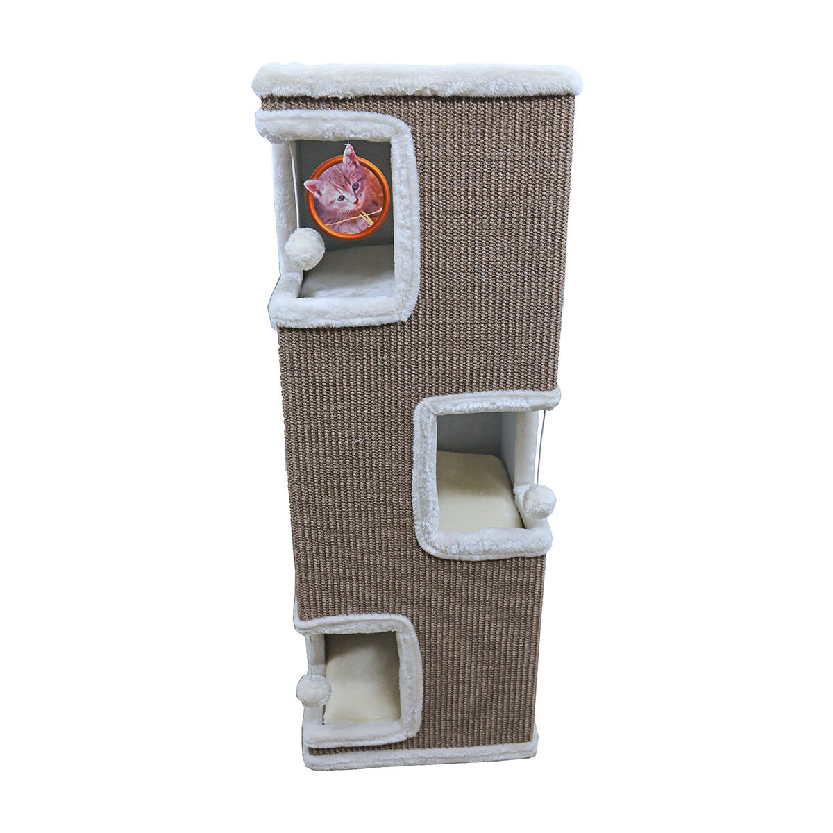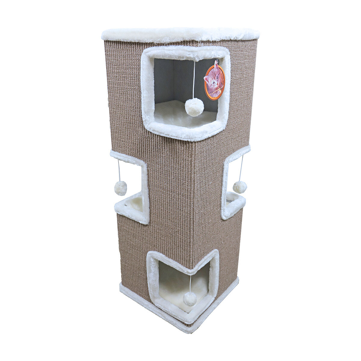 Vierkante klimtoren met diverse openingen. Inclusief speeltjes om aan te krabben en mee te spelen. Voorzien van comfortabel kussens. Het stevige sisal is taupekleurig en afgewerkt met contrasterende crème pluche. De gehele buitenkant van de klimtoren kan gebruikt worden als krabpaal. De klimtoren heeft dus meerdere functies: rustplek, speelplek en schuilplek.