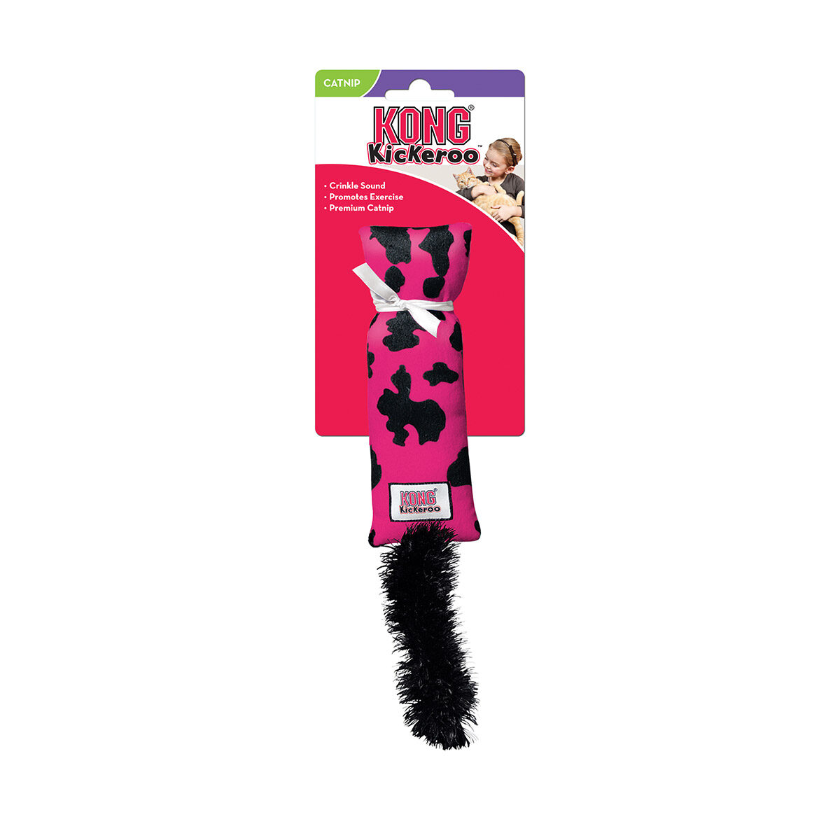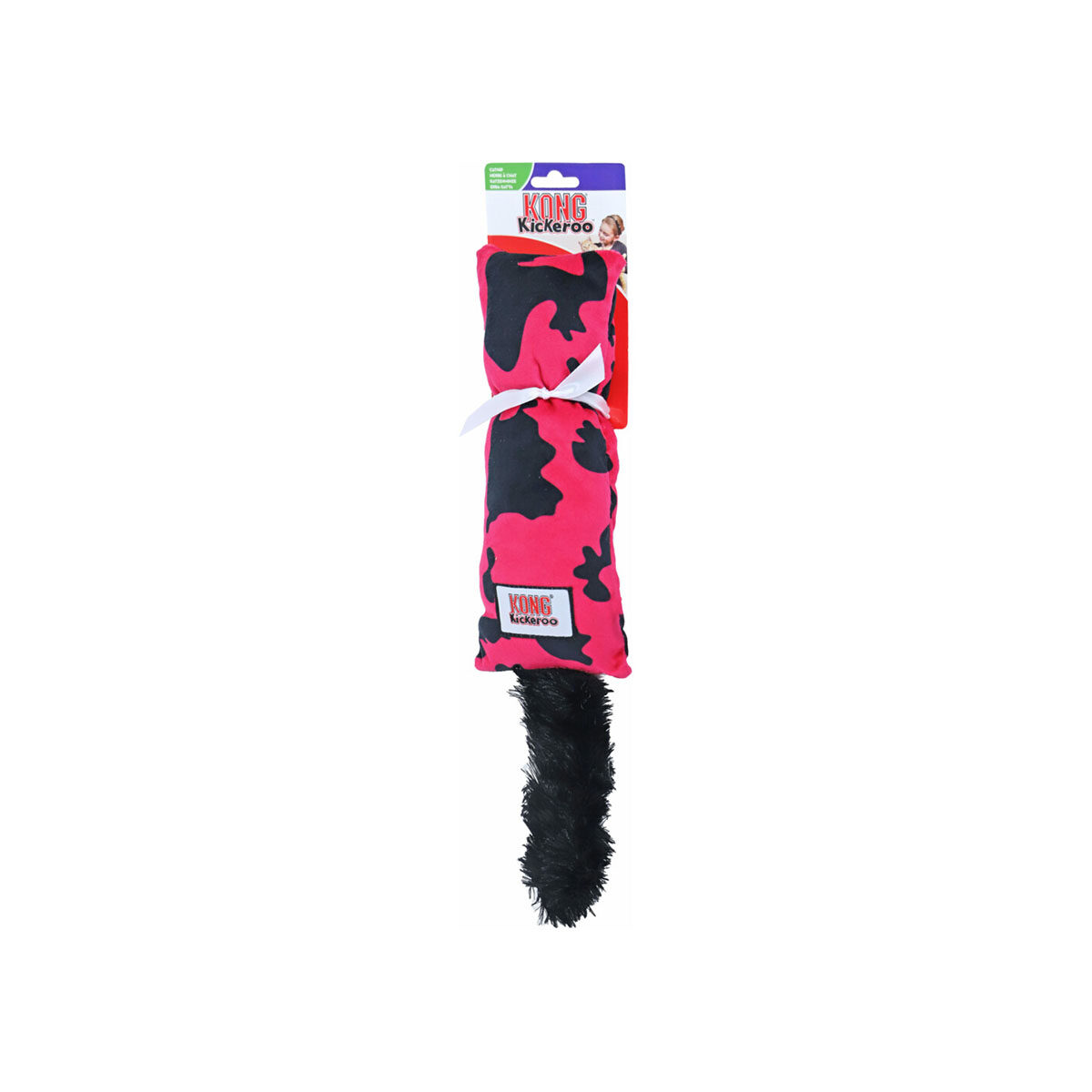 KONG Kat Kickeroo Koe Print. Met dit speelgoed wordt jouw kat echt uitgedaagd. Het materiaal en de vorm van dit speeltje stimuleren het jachtinstinct van jouw kat. Hij zal ermee worstelen en met zijn achterpoten tegenaan schoppen. De pluizige staart beweegt, net als een echte prooi. Dit speeltje bevat ook kattenkruid om het spelen nog meer aan te moedigen. Wees niet verbaasd dat de Kickeroo het favoriete speeltje van je kat wordt!