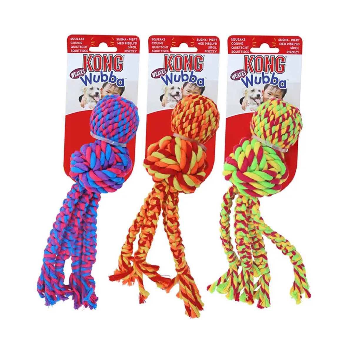 KONG Weaves Rope Assorti. Large. De KONG Wubba Weaves Rope is gemaakt van robuust geweven touw. De gedraaide knoop biedt veel kauwplezier. Hiermee speelt KONG in op het natuurlijke kauwinstinct. Het kauwen hierop helpt ook bij de reiniging van tanden en tandvlees. De lange staarten van dit speeltje zijn ideaal voor trek- en apporteerspelletjes. In de Kong Wubba Weaves Rope zit ook een piepertje voor nog meer speelplezier.De KONG Wubba Weaves Rope is gemaakt van robuust geweven touw. Dit speeltje is ideaal om te gebruiken als apporteer- en trekspeeltje. Let op! Dit product wordt assorti geleverd, hierdoor is er geen kleurkeuze mogelijk.