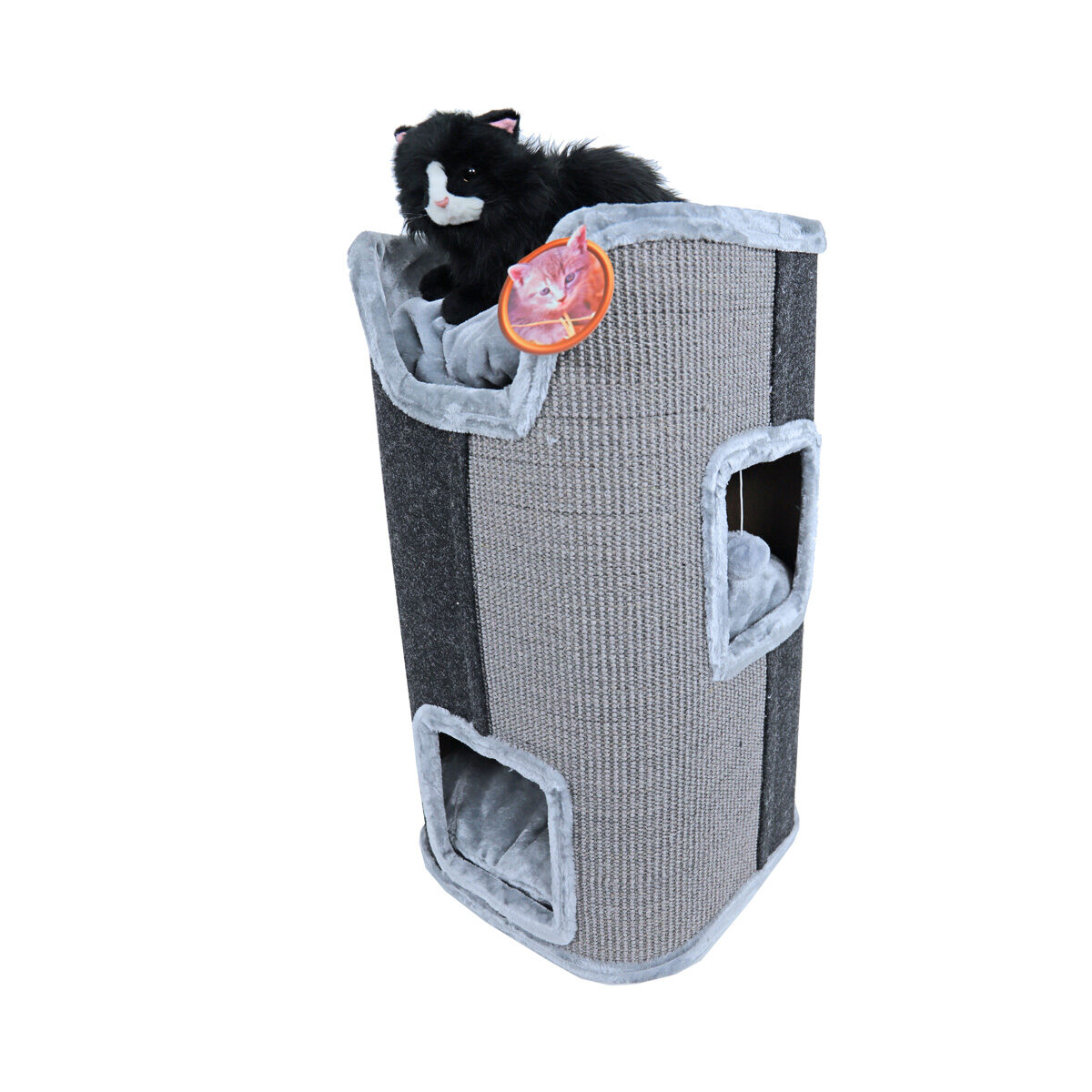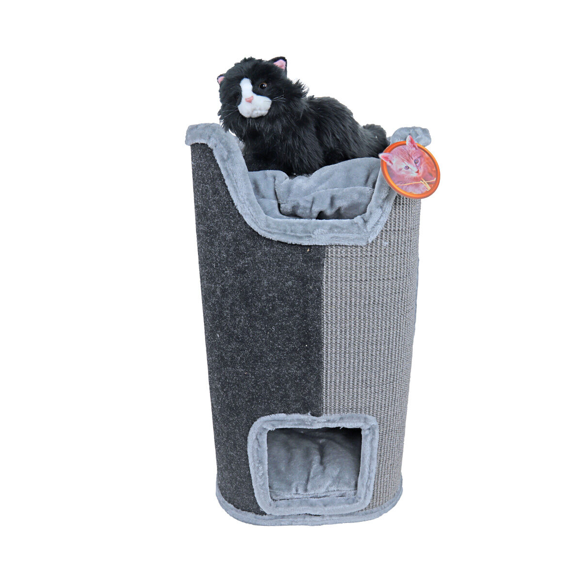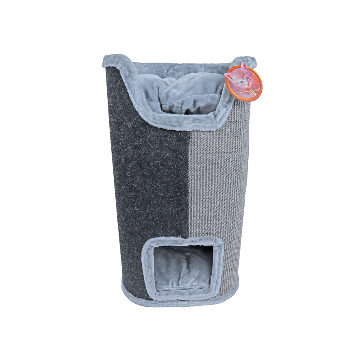 Krab/Klimmeubel 2 Gaats Grijs-Zwart is een stoere robuuste ton waaraan jouw kat kan krabben, in kan klimmen en in kan slapen. Het krabben is mogelijk door de stevige sisalmatten die aan de buitenkant van de ton bevestigd zijn. Het klimmen wordt mogelijk gemaakt door de verschillende verdiepingen en de grootte van 42x42x76 cm. Slapen kan jouw kat op de drie slaapplaatsen met een zacht pluchen kussen. Er hangt ook nog een leuk speelballetje in de bovenste verdieping.
