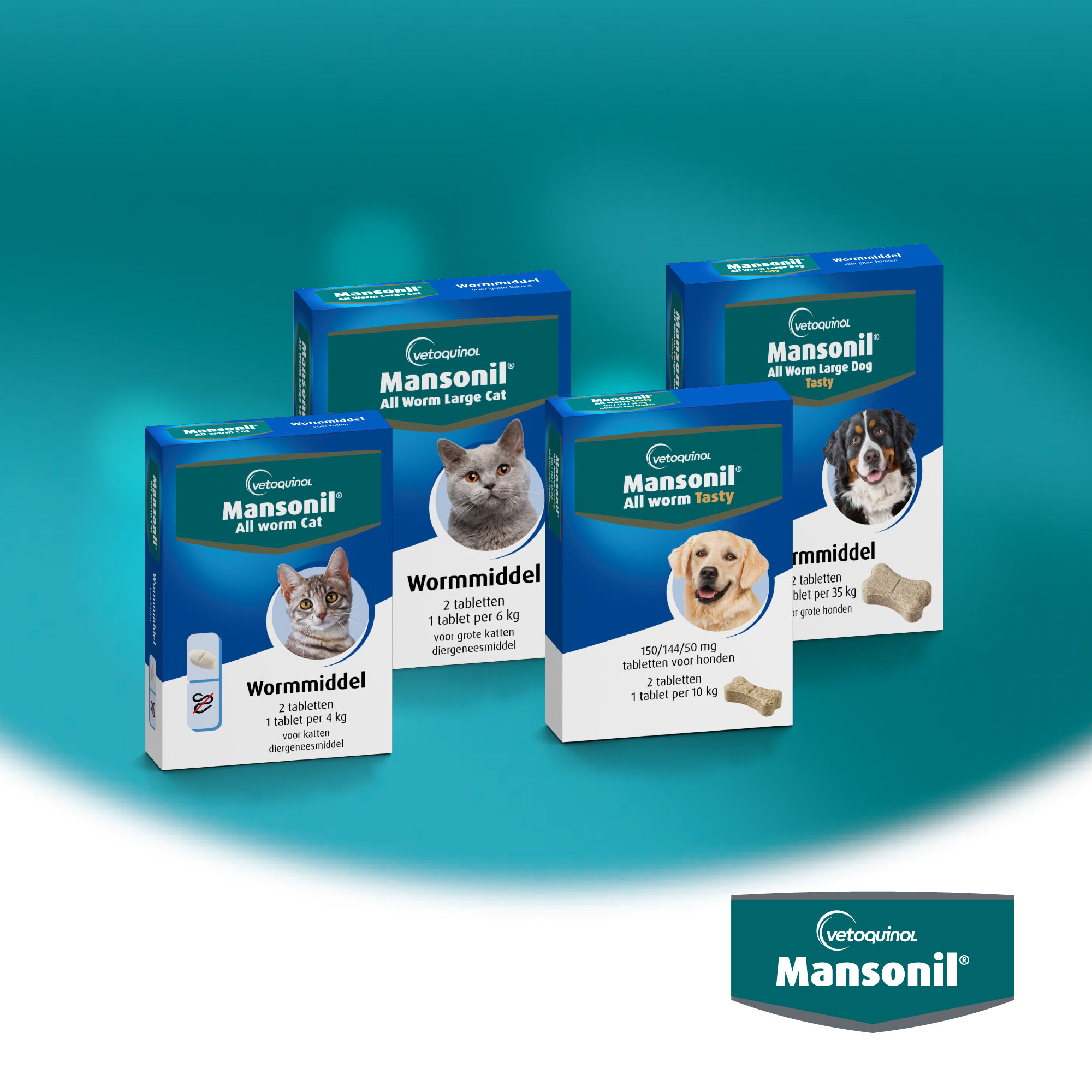 Mansonil All Worm Large Dog Tasty (febantel/ pyrantelembonaat/ praziquantel) tabletten voor grote honden (525/504/175 mg). Indicaties: Voor de behandeling van gemengde infecties met nematoden en cestoden van de volgende soorten: Spoelwormen (volwassen en late immature vormen): Toxocara canis, Toxascaris leonine; Haakwormen (volwassen vormen): Uncinaria stenocephala, Ancylostoma caninum; Zweepwormen (volwassen vormen): Trichuris vulpis; Lintwormen (volwassen en immature vormen): Echinococcus granulosus, Echinococcus multilocularis, Dipylidium caninum, Taenia spp., Mesocestoides spp.. Dosering: 1 tablet per 35 kg lichaamsgewicht. Contra-indicaties: Niet gebruiken bij overgevoeligheid voor het werkzame bestanddeel of één van de hulpstoffen. Niet gebruiken tijdens het eerste en tweede trimester van de dracht. Bijwerkingen: In zeer zeldzame gevallen kunnen milde en voorbijgaande maagdarmklachten (bv. braken) optreden. Aflevering: VRIJ – REG NL 119740. Registratiehouder: Vetoquinol S.A.. Verdere informatie op aanvraag beschikbaar via info.nl@vetoquinol.com.