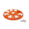Op een ronde schijf staan holle botjes. Onder deze holle botjes verstop je een snoepje. Laat jouw hond de snoepjes zoeken door te krabben en gebruik te maken van zijn snuit om de botjes op te tillen en de snoepjes eronder te kunnen pakken. Hij wordt mentaal uitgedaagd om bij zijn snack te komen.