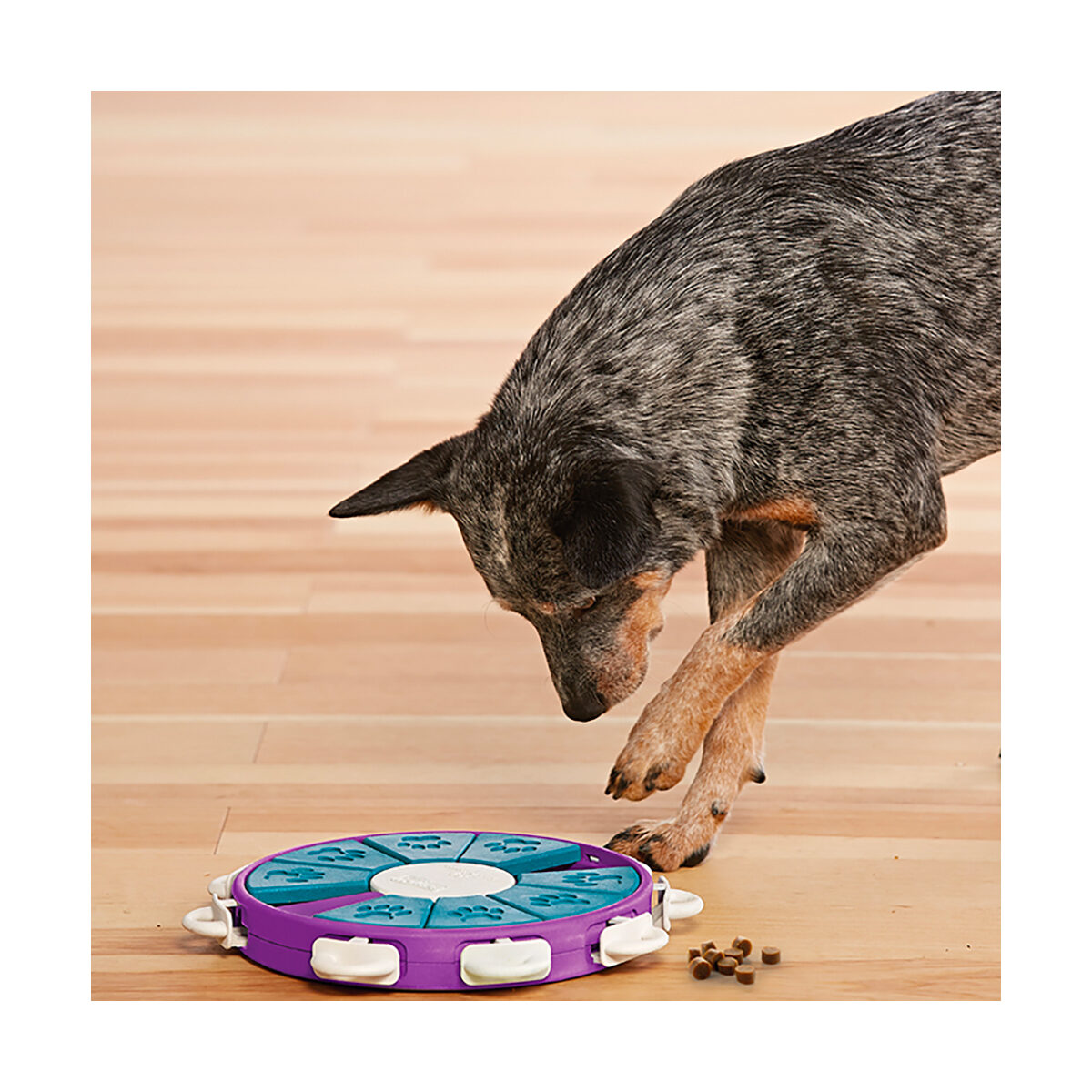 Het spel kan nog uitdagender gemaakt worden door de schijven met pluggen vast te zetten, die de hond dan eerst moet verwijderen, voordat de schijven verschoven kunnen worden. De Dog Twister is er natuurlijk voor om samen met jouw hond een leuke tijd te hebben. Jouw hond moet leren om het snoepje, de beloning, te vinden door de ene na de andere schijf in verschillende richtingen te verschuiven. Onder deze schijven zitten uitsparingen waarin de snoepjes verborgen kunnen worden. Doe het eerst je hond voor zodat hij het later na kan doen. Jouw hond kijkt, luistert, ruikt en leert.