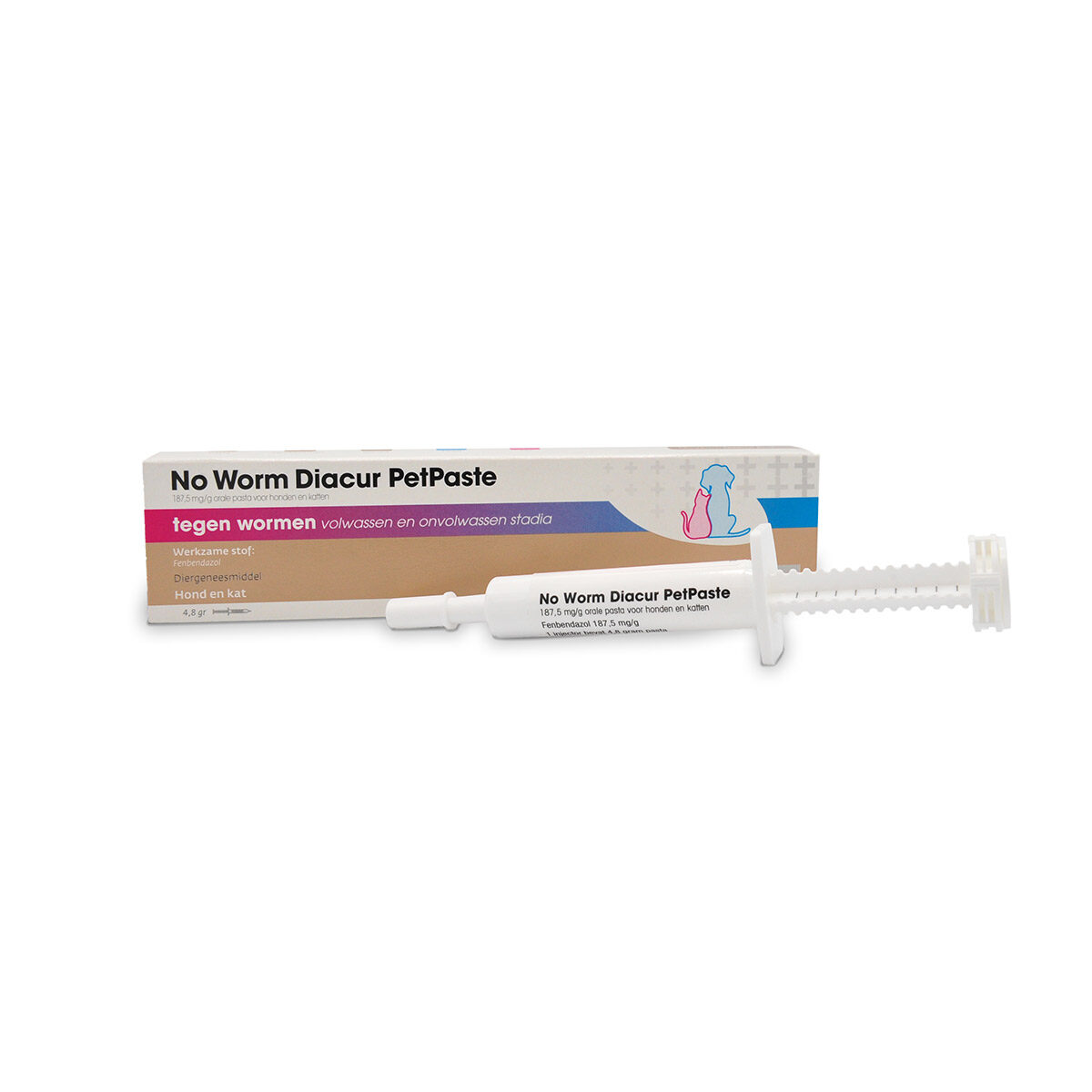 No Worm Diacur heeft een dubbele werking. De meest voorkomende spoel-, zweep-, haak- en lintwormsoorten worden bij hond en kat bestreden! En met de No Worm Diacur PetPaste (Fenbendazol behandeling) wordt daarnaast de Giardia parasiet bestreden bij honden. No Worm Diacur heeft dezelfde werking als Panacur.