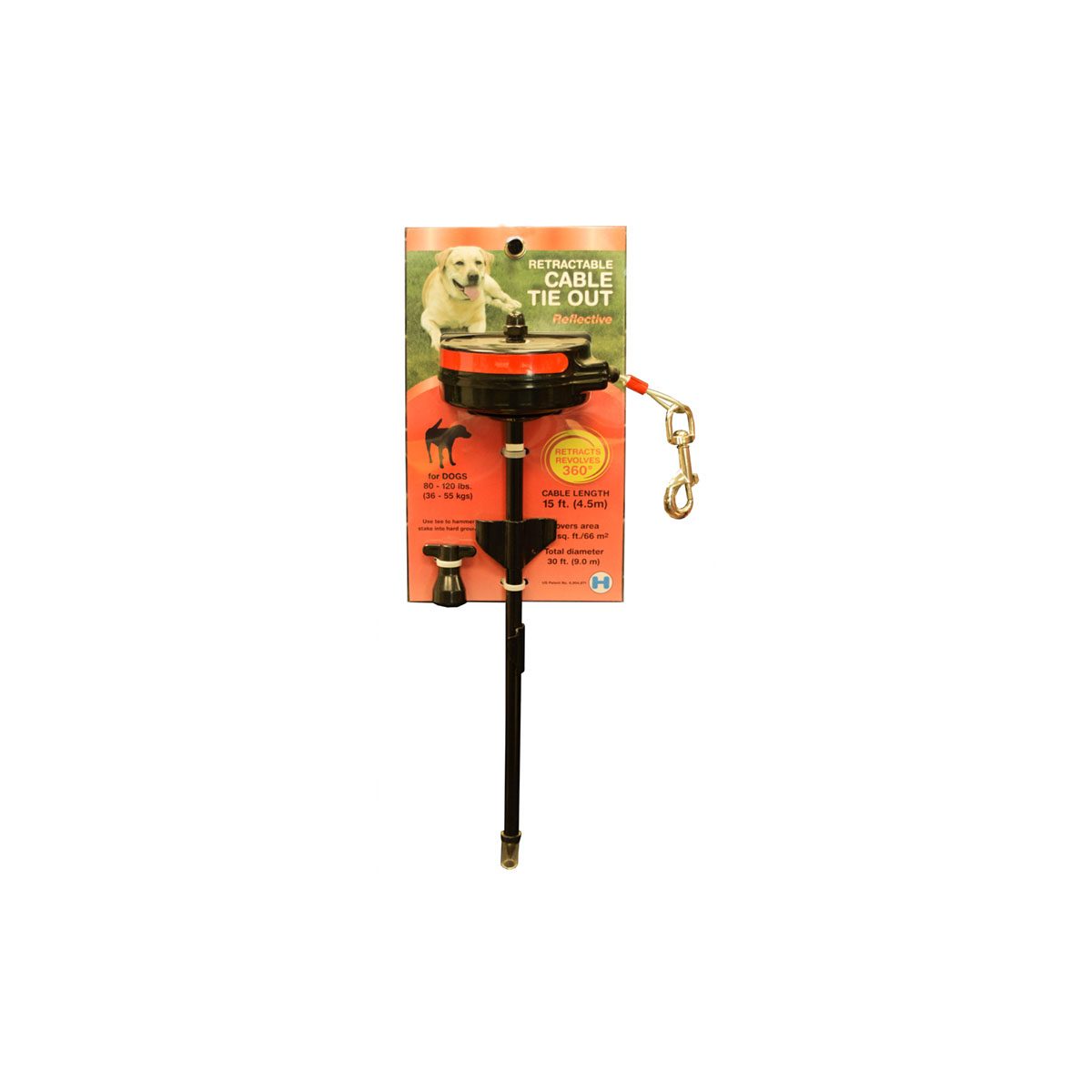 Zware metalen bodempin, 360? roterend met oprolbare staalkabel. Ideaal om je hond vast te zetten en hem toch genoeg bewegingsvrijheid te geven. Soepel lopende kabel trekt strak maar blijft comfortabel voor de hond! Voorkomt dat de hond zich verstrikt in d