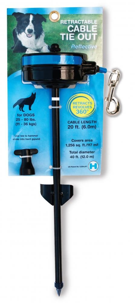 Zware metalen bodempin, 360? roterend met oprolbare staalkabel. Ideaal om je hond vast te zetten en hem toch genoeg bewegingsvrijheid te geven. Soepel lopende kabel trekt strak maar blijft comfortabel voor de hond! Voorkomt dat de hond zich verstrikt in d