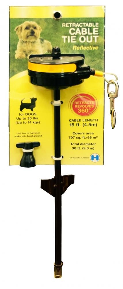 Zware metalen bodempin, 360? roterend met oprolbare staalkabel. Ideaal om je hond vast te zetten en hem toch genoeg bewegingsvrijheid te geven. Soepel lopende kabel trekt strak maar blijft comfortabel voor de hond! Voorkomt dat de hond zich verstrikt in d