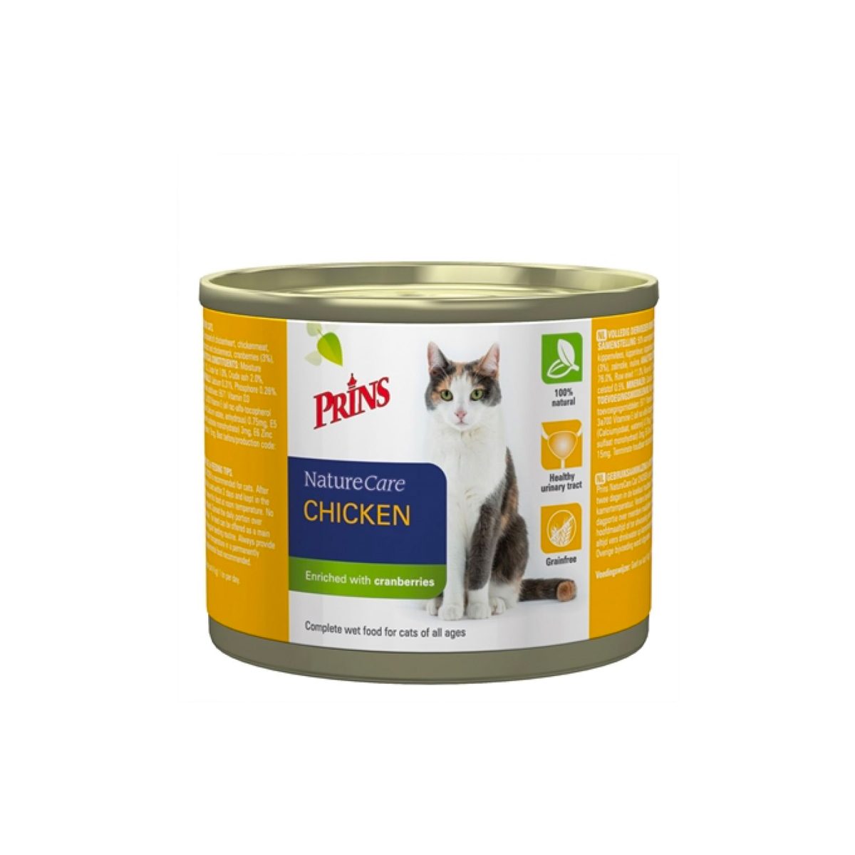 Prins Naturecare Kat Chicken 200gr. Prins NatureCare is een gezonde en 100% natuurlijke vleesmaaltijd in blik. De voeding is volledig graanvrij en bevat gezonde ingrediënten. Katten eten het graag vanwege de speciale draadjesvlees structuur. De voeding is zeer vochtrijk en dit is goed, omdat katten slechte drinkers zijn. NatureCare Chicken is verrijkt met cranberries die een positieve werking hebben op de blaas.