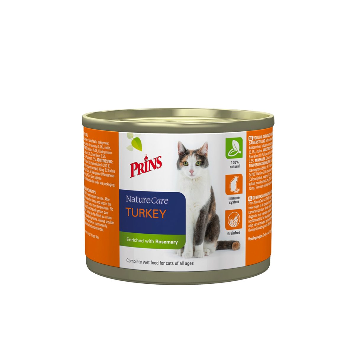 Prins Naturecare Kat Turkey 200gr. Prins NatureCare is een gezonde en 100% natuurlijke vleesmaaltijd in blik. De voeding is volledig graanvrij en bevat gezonde ingrediënten. Katten eten het graag vanwege de speciale draadjesvlees structuur. De voeding is zeer vochtrijk en dit is goed, omdat katten slechte drinkers zijn. NatureCare Turkey is verrijkt met rozemarijn, dat zorgt voor een gezond immuunsysteem.