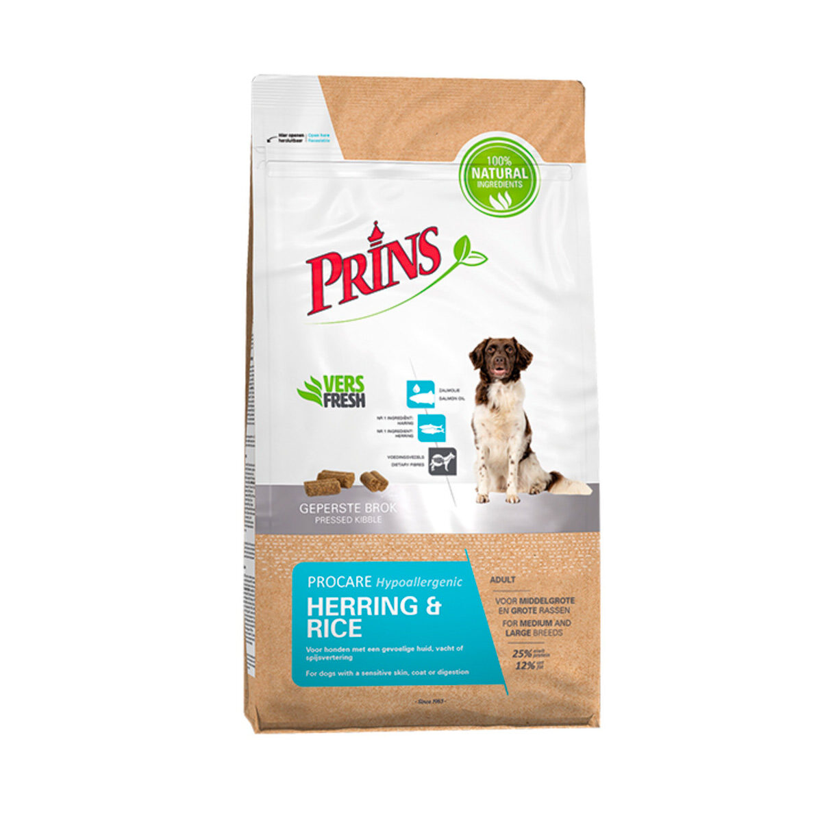 Prins ProCare Herring & Rice is een geperste brokvoeding voor honden van middelgroot en groot formaat. De brokken smaken naar haring maar ruiken niet té sterk naar vis. Deze hypoallergene brokken met haring en rijst zijn uitermate geschikt voor honden die een voeding nodig hebben met vis als enige dierlijke eiwitbron. De voeding is verrijkt met zalmolie, wat rijk is aan omega-3 vetzuren. Voedingvezels dragen bij aan een evenwichtige darmflora. De geperste brokken ondersteunen de huid, vacht en spijsvertering van jouw hond optimaal. Een ander pluspunt van deze voeding is dat haring de meest duurzame vissoort is voor het gebruik in hondenvoeding.