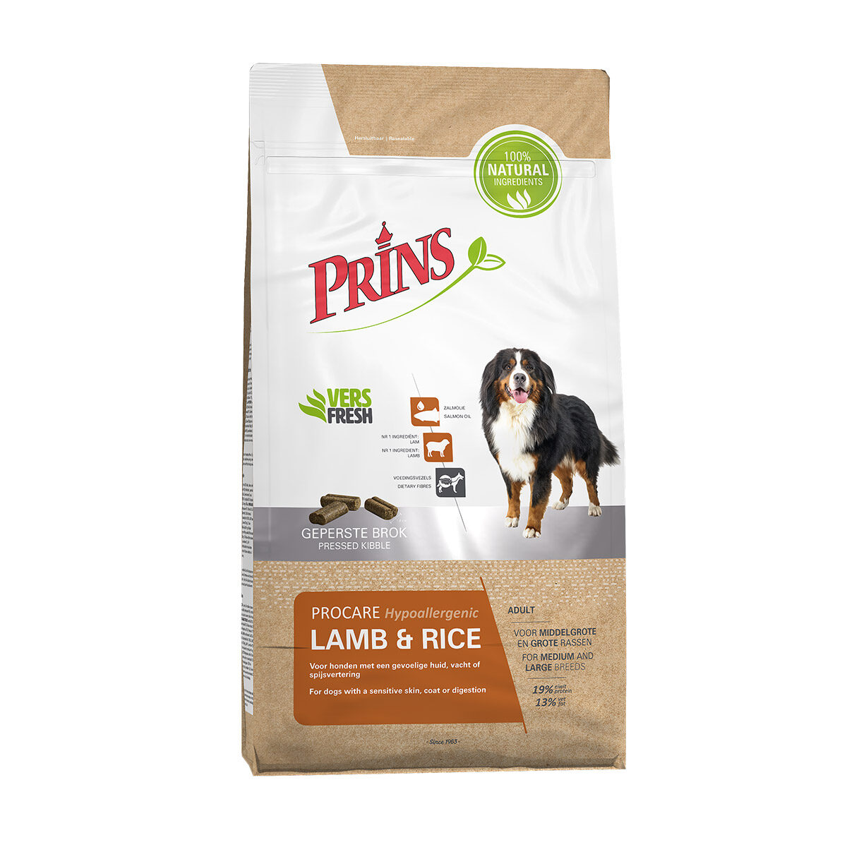 Prins ProCare Lamb & Rice Hypoallergic 3 kg. Prins ProCare Lamb & Rice Hypoallergic is een geperste voeding voor gevoelige volwassen honden tot circa 8 jaar. Deze volledige voeding wordt gemaakt van kwalitatief hoogwaardig lamsmeel en biedt ondersteuning aan honden die allergisch reageren op andere eiwitbronnen. Daarnaast bevat ProCare Lamb & Rice Hypoallergic vezels die de gezondheid van de darmen bevorderen.