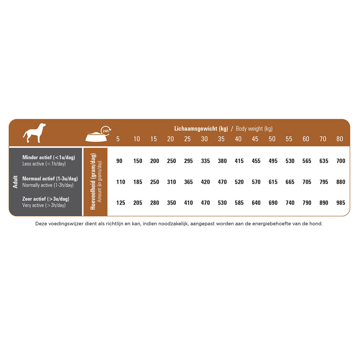 Lichaamsgewicht (kg) | Hoeveelheid (gram/dag) | Hoeveelheid (gram/dag) | Hoeveelheid (gram/dag) |