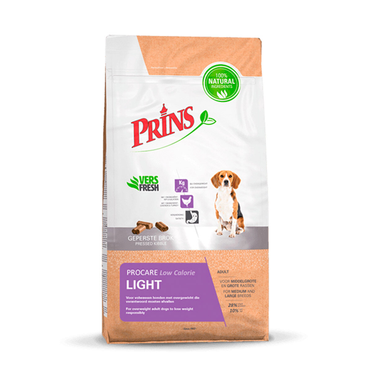 Prins ProCare Light Low Calorie 3 kg. Prins ProCare Light Low Calorie is een geperste voeding voor honden vanaf 18 maanden met overGewicht:. Dankzij een laag vetgehalte en de toevoeging van voedingsvezels helpt deze volledige voeding jouw hond op een verantwoorde manier af te vallen. De balans in voedingselementen zorgt ervoor dat jouw hond in optimale conditie blijft gedurende de afvalperiode.