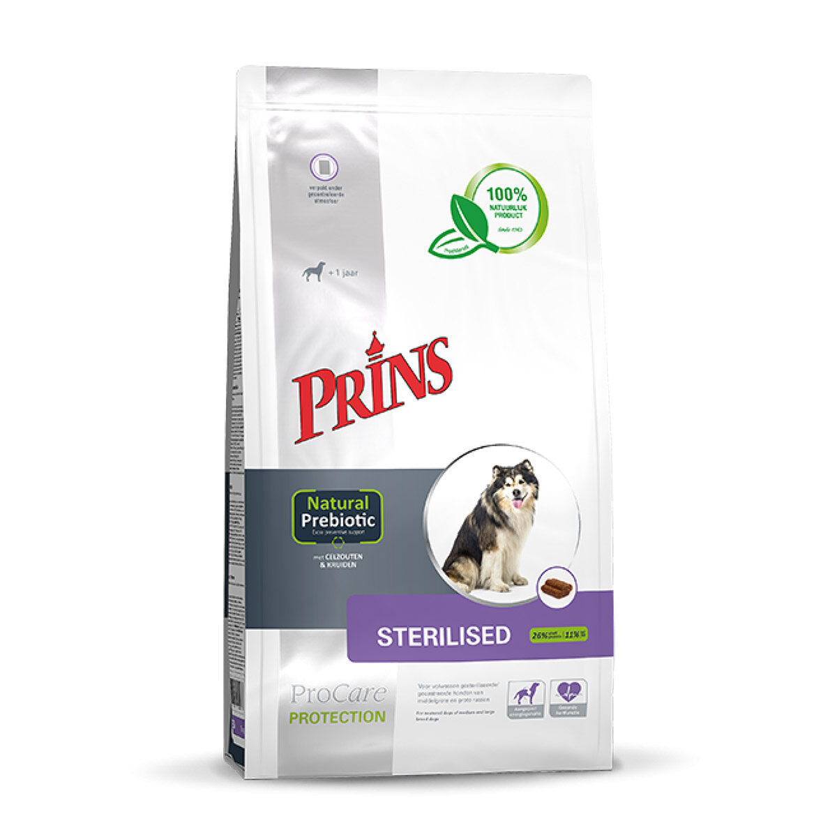 Prins ProCare Protection Sterilised 15 kg. Prins ProCare Protection Sterilised is een geperste voeding voor volwassen gesteriliseerde of gecastreerde honden van middelgrote en grote rassen. De voeding is ook geschikt voor honden met een lagere energiebehoefte of voor honden met neiging tot overGewicht:. Deze volledige voeding, verrijkt met zalmolie, FOS, kruidenextracten en Schüssler celzouten, draagt bij aan een gezonde hartfunctie en ondersteunt de botten en gewrichten. Een aangepast energiegehalte helpt een gezond Gewicht: te handhaven.