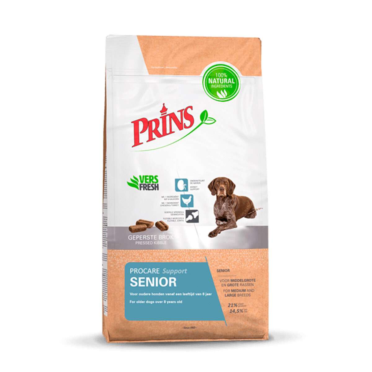 Prins ProCare Senior Support 3 kg. Prins ProCare Senior Support is een volledige geperste voeding voor oudere honden vanaf circa 8 jaar. Deze volledige voeding biedt ondersteuning aan honden op leeftijd. ProCare Senior Support bevat ingrediënten die de nieren ontlasten, bijdragen aan soepele spieren en gewrichten en een evenwichtige darmflora ondersteunen.