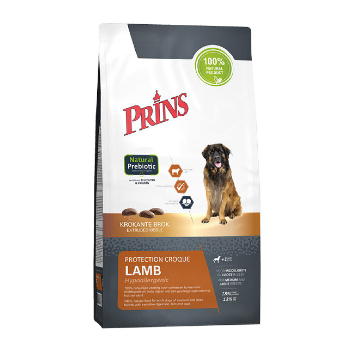 Prins Protection Croque Lamb Hypoallergic 10 kg. Protection Croque Lamb Hypoallergenic is een krokante voeding voor volwassen honden van middelgrote en grote rassen met een gevoelige spijsvertering, huid en vacht. Deze volledige voeding bevat één eiwitbron (lam), wat honden met een gevoelige huid en vacht ondersteuning biedt. Zorgvuldig geselecteerde ingrediënten als zalmolie, FOS, kruidenextracten en Schüssler celzouten dragen daarnaast bij aan een gezonde hartfunctie, soepele gewrichten en een gezonde huid en glanzende vacht. Daarnaast bevat Prins Protection Croque Lamb Hypoallergic ook géén tarwegluten.