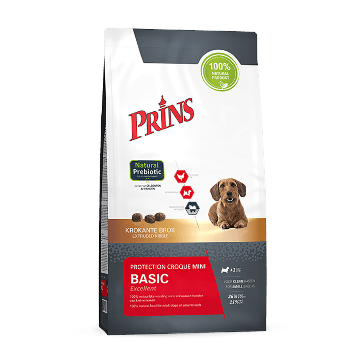 Prins Protection Croque Mini Basic Execllent Unizak 10 kg. Protection Croque Mini Basic Excellent is een krokante voeding voor volwassen honden van kleine rassen. De voeding is ook geschikt voor gesteriliseerde en gecastreerde honden en honden die snel neiging hebben tot overGewicht:. Deze volledige voeding, verrijkt met zalmolie, inuline, probiotica, yucca, kruidenextracten en Schassler celzouten, draagt bij aan een goede darmflora, gezond gebit en zorgt voor een verzadigd gevoel. Een aangepast energiegehalte helpt een gezond Gewicht: te handhaven.