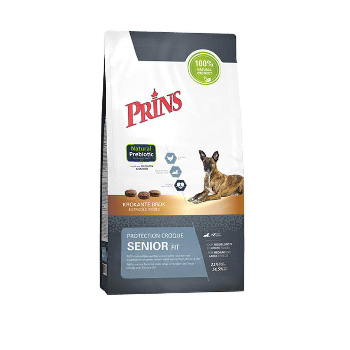 Prins Protection Croque Senior Fit 2 kg. Protection Croque Senior Fit is een krokante voeding voor oudere honden van middelgrote en grote rassen vanaf circa 8 jaar. Deze volledige voeding, verrijkt met zalmolie, FOS, kruidenextracten en Schüssler celzouten, ondersteunt de hart- en nierfunctie, draagt bij aan soepele spieren en gewrichten en beschermt de hond tegen ouderdomsverschijnselen. De voordelen van Prins Protection Croque Senior Fit zijn: