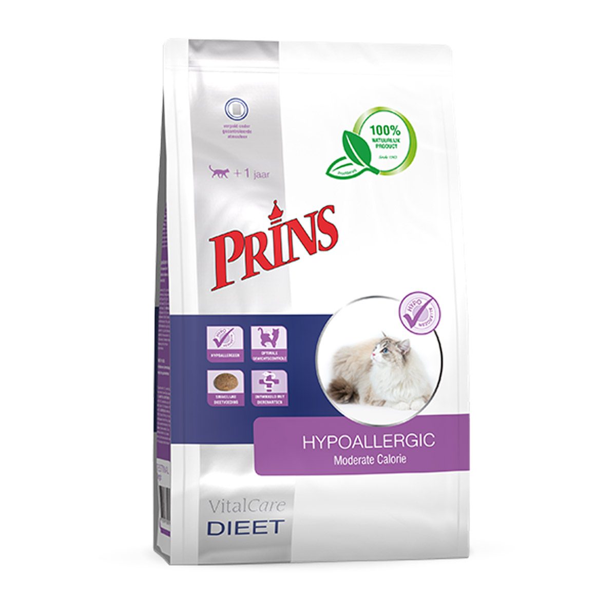 Prins Vitalcare Dieet Hypoallergic Moderate Cal 1,5 kg. VitalCare Dieet Hypoallergic Moderate Calorie is speciaal geschikt voor volwassen katten met een voedselovergevoeligheid (huid- en vachtproblemen) en/of ter ondersteuning van maagdarmproblemen. Dit dieet bevat één dierlijke eiwitbron en is tarweglutenvrij, wat de kans op een overgevoeligheidsreactie vermindert. De zorgvuldig geselecteerde ingrediënten dragen bij aan een evenwichtige darmflora en een verbeterde conditie van de gevoelige huid. De voeding helpt katten met een lagere energiebehoefte, zoals gacastreerde katten of katten met een neiging tot overgewicht, op een gezond gewicht te houden.