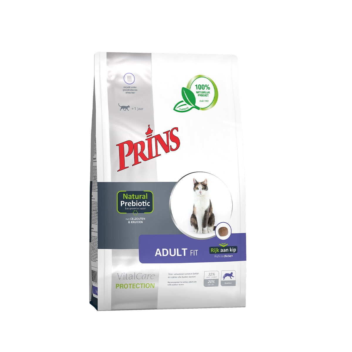 Prins Vitalcare Protection Adult Fit 5 kg. Prins VitalCare Protection Adult Fit is een voeding speciaal voor volwassen actieve katten en katten die buiten komen. Deze voeding is verrijkt met kruidenextracten & Schüssler celzouten voor de juiste ondersteuning van jouw kat, is rijk aan kip en bevat hoogwaardige voedingsvezels die bijdragen aan een gezonde darmflora. De voeding bevat speciale mineralen (hexametafosfaat) die de vorming van tandplaque helpen te verminderen. Alle producten van Prins zijn 100% natuurlijk, vrij van geur kleur- en smaakstoffen en proefdiervrij.