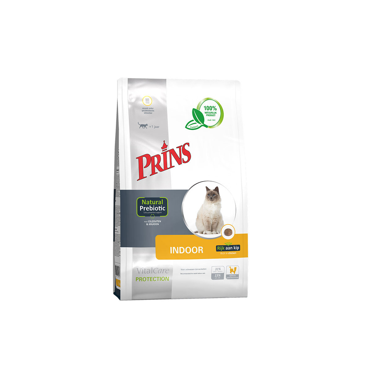 Prins Vitalcare Protection Indoor 1,5 kg. Prins VitalCare Protection Indoor is een voeding speciaal voor volwassen binnenkatten. Deze voeding is verrijkt met kruidenextracten & Schüssler celzouten voor de juiste ondersteuning van jouw kat, is rijk aan kip en bevat hoogwaardige voedingsvezels die bijdragen aan een gezonde darmflora. De voeding bevat speciale mineralen (hexametafosfaat) die de vorming van tandplaque helpen te verminderen.