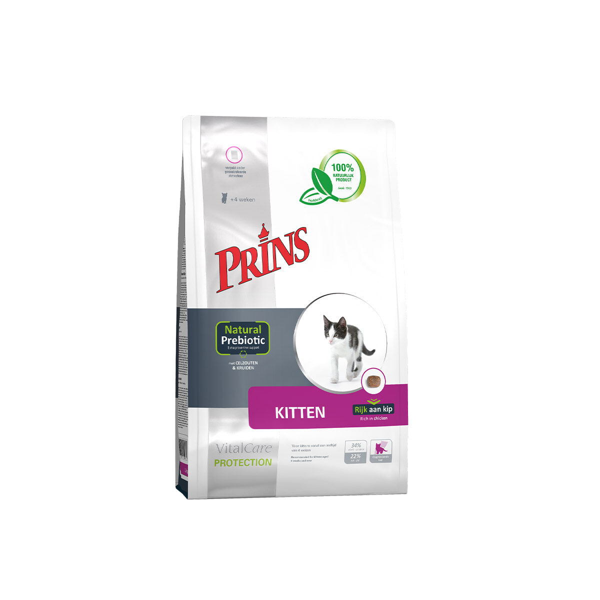Prins Vitalcare Protection Kitten 1,5 kg. Prins VitalCare Protection Kitten is een voeding speciaal voor kittens vanaf een leeftijd van 4 weken. Deze voeding bevat alle voedingsstoffen die nodig zijn voor een goede en gelijkmatige opgroei en bevat extra lysine ter ondersteuning van de weerstand. De voeding is verrijkt met kruidenextracten & Schüssler celzouten voor de juiste ondersteuning van jouw kat, is rijk aan kip en bevat hoogwaardige voedingsvezels die bijdragen aan een gezonde darmflora.