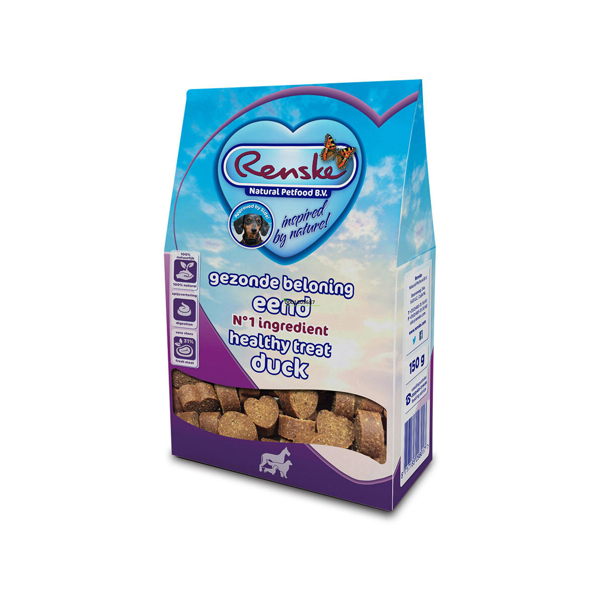 Renske Gezonde Beloning Hond Hartjes Eend 150 gr is een smakelijke, glutenvrije beloning voor de hond. Ideaal als verantwoord tussendoortje of trainingsbeloning!