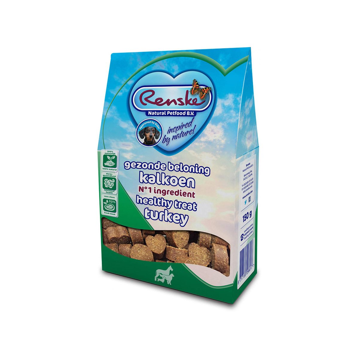 Renske Gezonde Beloning Hond Hartjes Kalkoen 150 gr is een smakelijke, glutenvrije beloning voor de hond. Ideaal als verantwoord tussendoortje of trainingsbeloning!